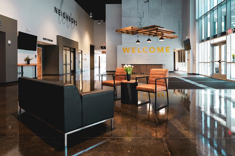 That initial concern was that the space didn’t direct folks comfortably. If you were coming into the building for the first time, you wouldn’t know where to go when you walked in. It wasn’t intuitive. So, the goal was to create a space that felt welcoming and had a variety of conversational areas. I also wanted to nod to the church’s beginnings. It was initially founded in a small warehouse with an equally small budget. It was very industrial. I wanted to bring some of that history into this new modern space that they had built. We did that by adding ... iron and warming it up with some wood tones. The space is very open. The lobby area is very grand. One wall in the lobby is floor-to-ceiling windows, and then there are two paths into the auditorium. It was a blank canvas, really.