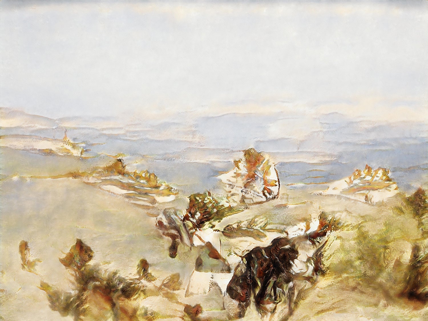 Kovalis and Fisher based their initial prototype off a “generative adversarial network” (a pair of algorithms that communicate with and learn from one another to improve their performance), working to develop AI that would produce, at scale, original, varied and accessible artworks. The pieces are distinct, referencing a range of artistic styles, but they always depart from something familiar. And there’s a reason for that.
