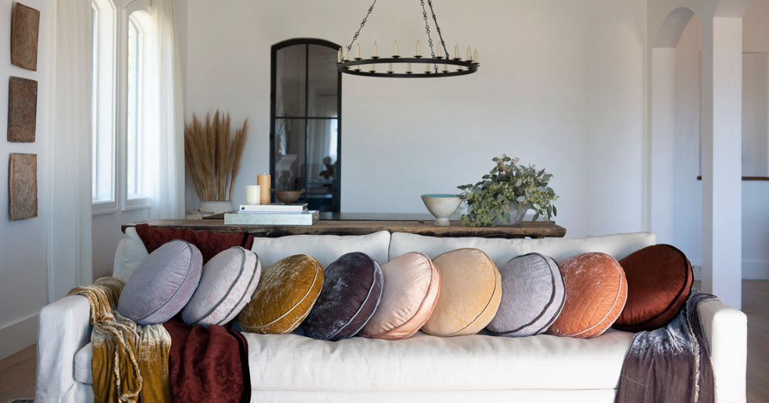 Round pillows—Bella Notte Linens Calling to mind a sumptuous macaron, these velvet-clad round pillows are a treat for the eyes.