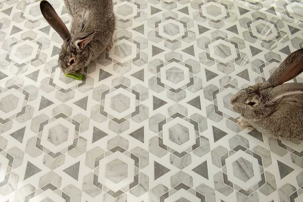 SNOWFALL MOSAIC — NEW RAVENNA The geometric, snowflakelike pattern in the Snowfall mosaic by New Ravenna is crafted from an array of hand-cut stones, including honed Thassos and polished Carrara marble.
