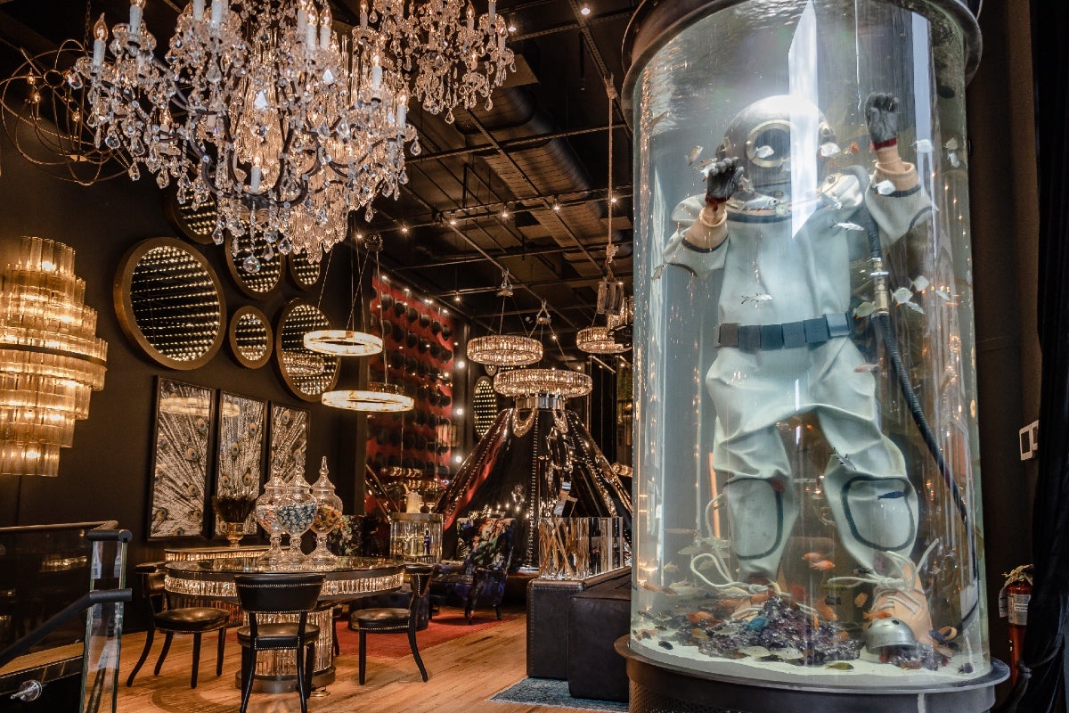 British furniture brand Timothy Oulton has opened a new U.S. flagship at 901 Broadway in Manhattan’s Flatiron district, displaying the company’s full range of furnishings, lighting and accessories, along with other handcrafted creations exclusive to the New York store. The 7,200-square-foot gallery is housed in a historic landmark building, recognized for its Gilded Age architecture. Inside, a highlight includes a replica of NASA’s Apollo 11 module, complete with a tufted velvet interior upholstered with the image of Botticelli’s The Birth of Venus—visitors can take a seat inside and enjoy a glass of champagne, or opt for a seat at the moonstone bar nearby.