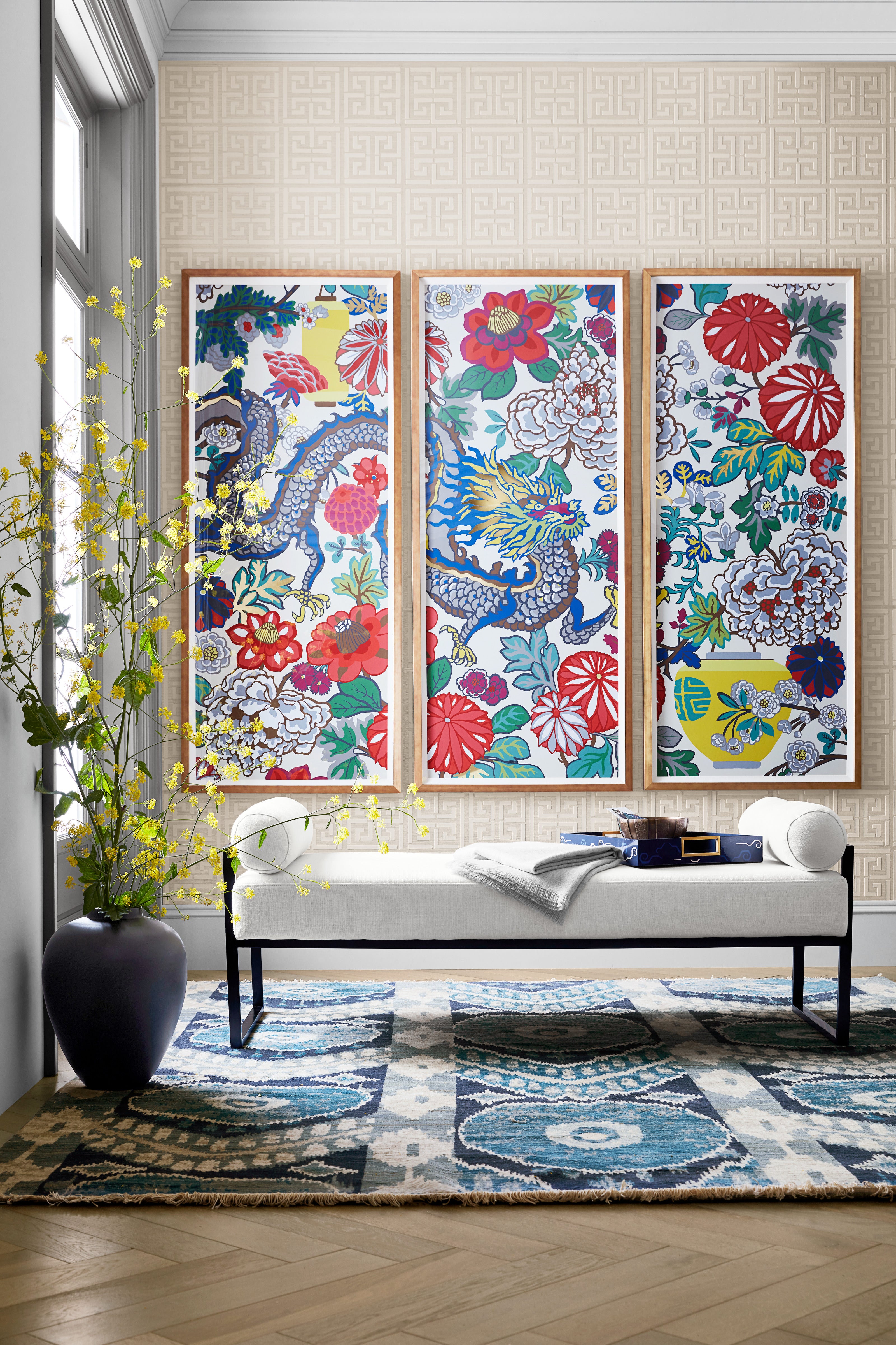 Schumacher partnered with Williams-Sonoma on a new collection of tabletop, upholstered furniture, bedding and decor. This marks the first time that Schumacher’s patterns, including Chiang Mai Dragon and Scallop Filigree, have been available in dinnerware and entertaining. Prices range from $14.95 for a hardmat to $4,600 for a triptych.