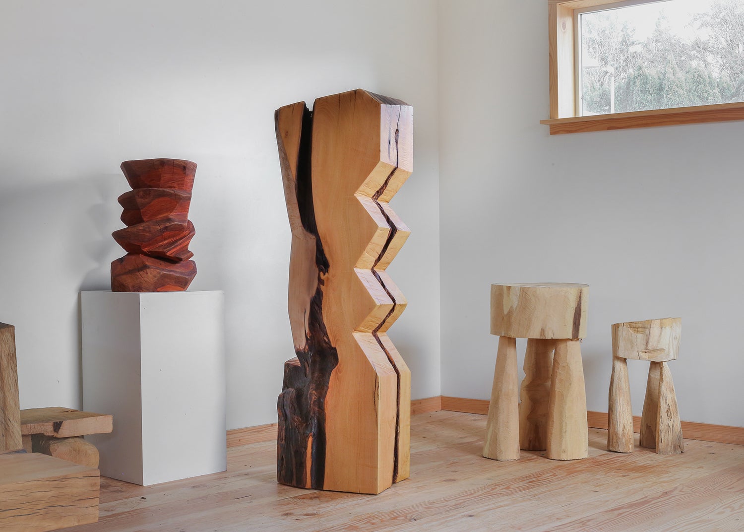 Skelly’s works have been commissioned by celebrity clients like Off-White CEO Virgil Abloh, Canadian chef Matty Matheson and designer Kelly Wearstler, but he prefers creating for the sake of it, allowing the sculptures to come from the nature of the wood instead of the reverse. His process begins with found or foraged wood, usually from fallen trees in the neighborhoods around his Portland studio. And when he can’t find any, he’s got a list of sustainable arborists that he can call for more material. “There’s this kind of scavenger aspect to it, which I like,” he says. “I get all types of wood because of that—hardwoods, less desirable woods, softwoods, weird pieces of wood—and in that sense, the form dictates what I can do with [it]. And I like those restrictions.” Once he has selected the wood, Skelly uses his chainsaw to cut the pieces into their basic shape before sanding and oiling them.