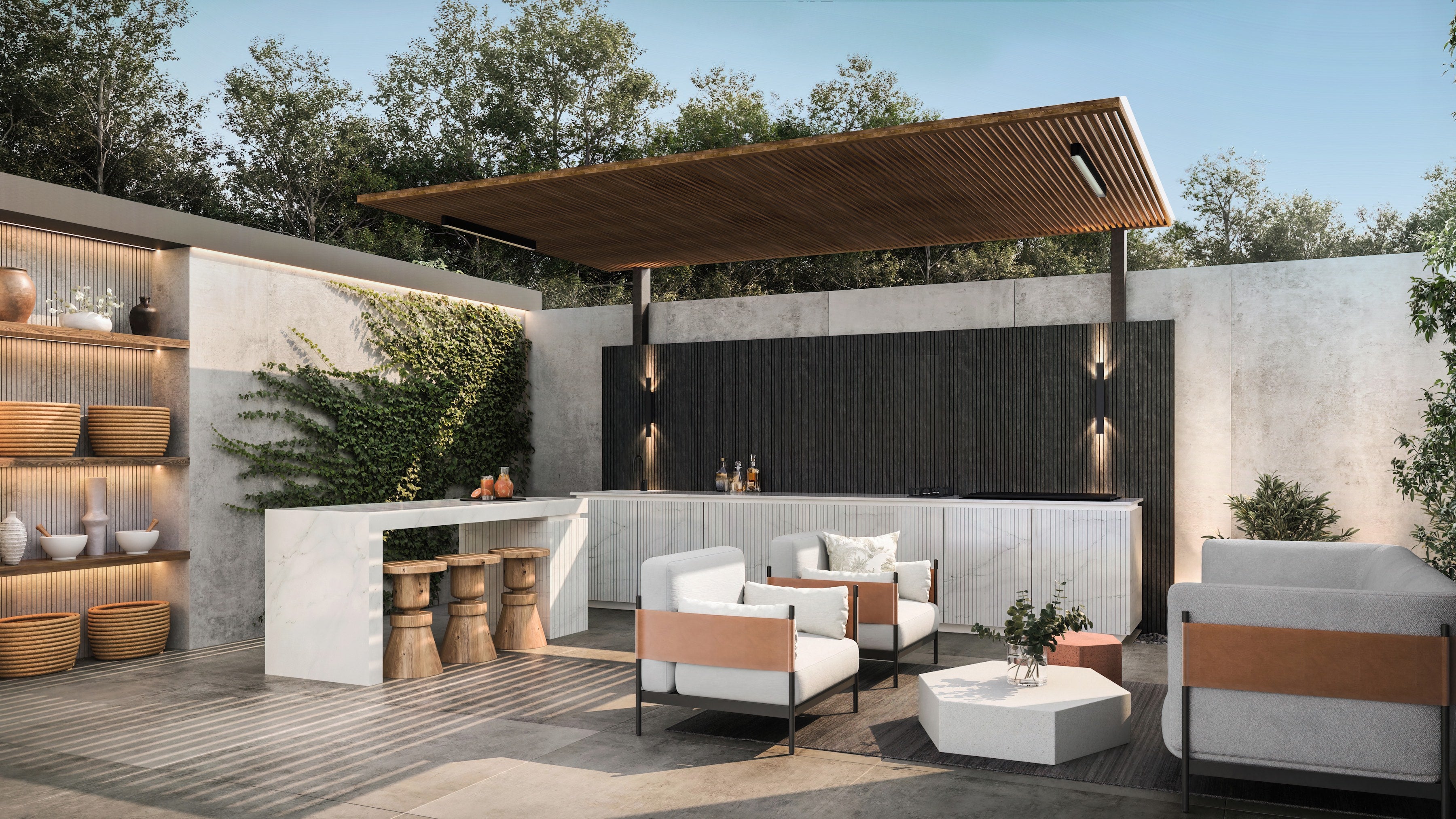 Ukiyo is Afshar’s first collaboration with Cosentino and the brand’s first foray into fluted surfaces. The designer foresees more creative exploration in their shared future. “I think this is the start of many exciting materials,” she says, describing her partnership with the company as “a dream come true.” She selected Ukiyo’s initial colorways from Dekton’s existing palette with an eye toward the comfortable, understated luxury and cohesive indoor-outdoor lifestyle that clients crave from their homes today. Below, she discusses the five versatile hues and the aesthetic impressions they make in their fluted Ukiyo incarnation.