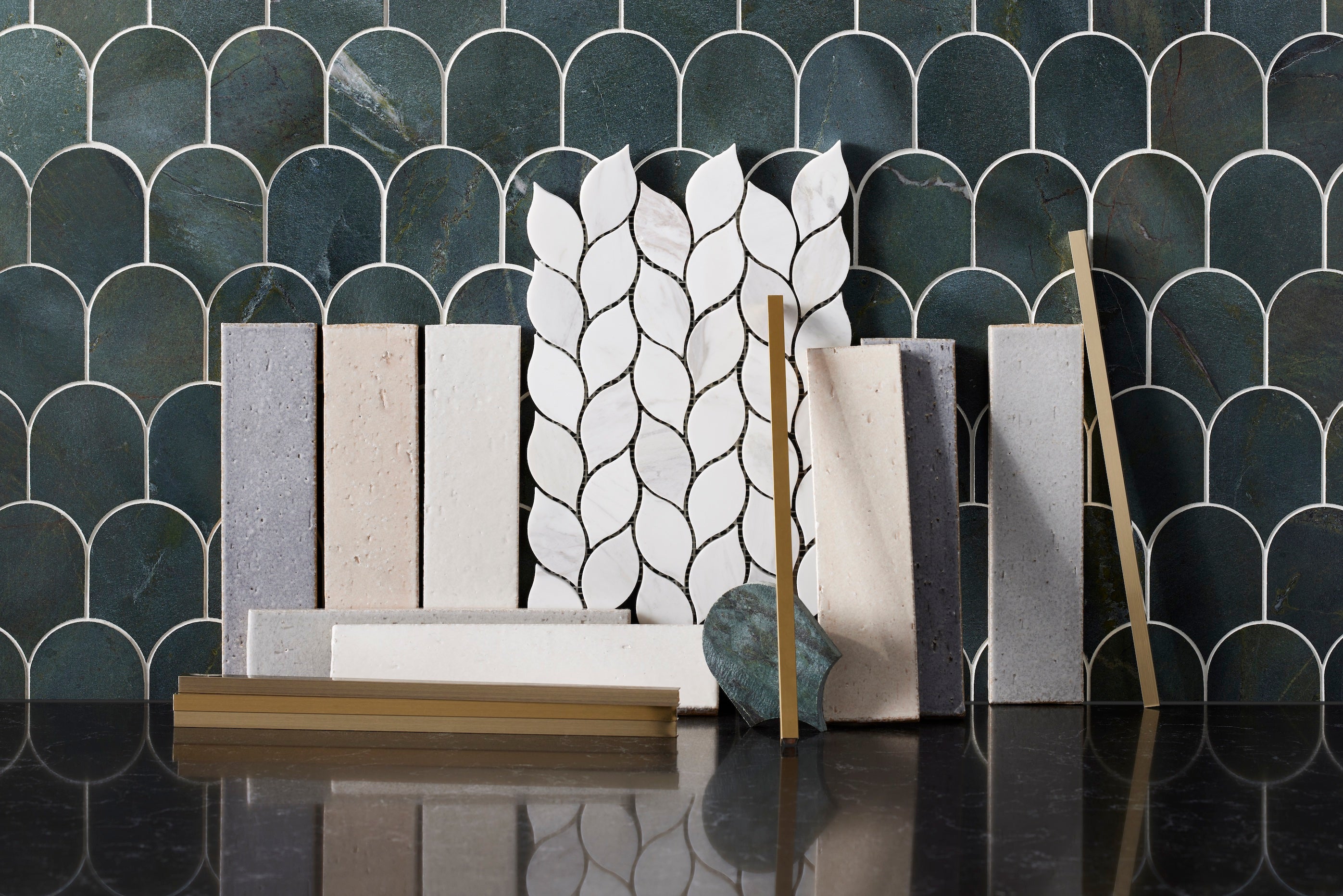 The two mosaic tiles that complete the collection harken beyond urbane Chicago to Victoria’s Mediterranean roots. Elia—Greek for “olive tree”—consists of Greek Volakas marble in a winding leaf pattern that evokes movement and nature. “This design feels like extending an olive branch,” she explains. “I visit Greece every year, and I wanted to share a common bond with the place that is so sacred to me.” Rendered in scalloped rows of green, Gem recalls classic architecture. The choice of both color and shape holds meaning for the designer, who considers green as essential as black and white and often adds archways to her interiors. “The deepness, darkness and richness of the color in this honed marble with a rounded edge is my absolute favorite,” she says. The style has already been introduced to several of her clients’ homes, as well as her own. In Victoria’s Las Vegas house, she used it on not only the bathroom walls but the floor too.