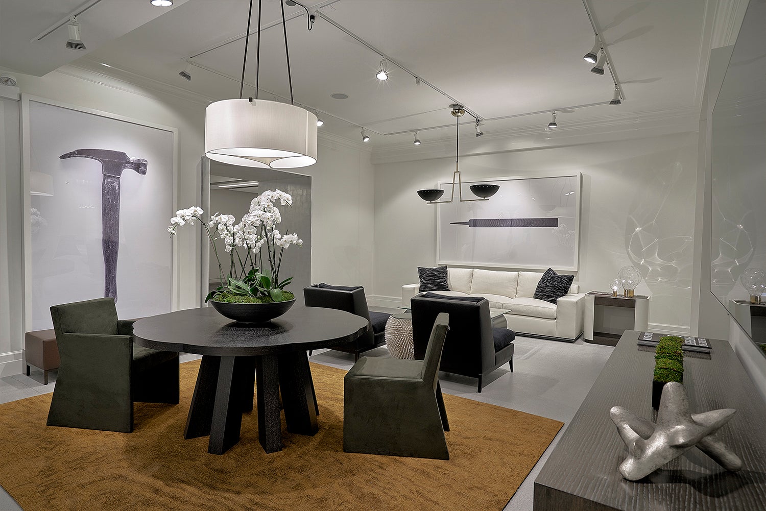 Luxury furniture manufacturer A. Rudin has relocated to Suite 1416 at the Design Center at the Mart in Chicago. The new 14th-floor showroom takes on the layout of a gallery, paring back the decorative elements for a streamlined space that displays its furniture lines like pieces of fine art.
