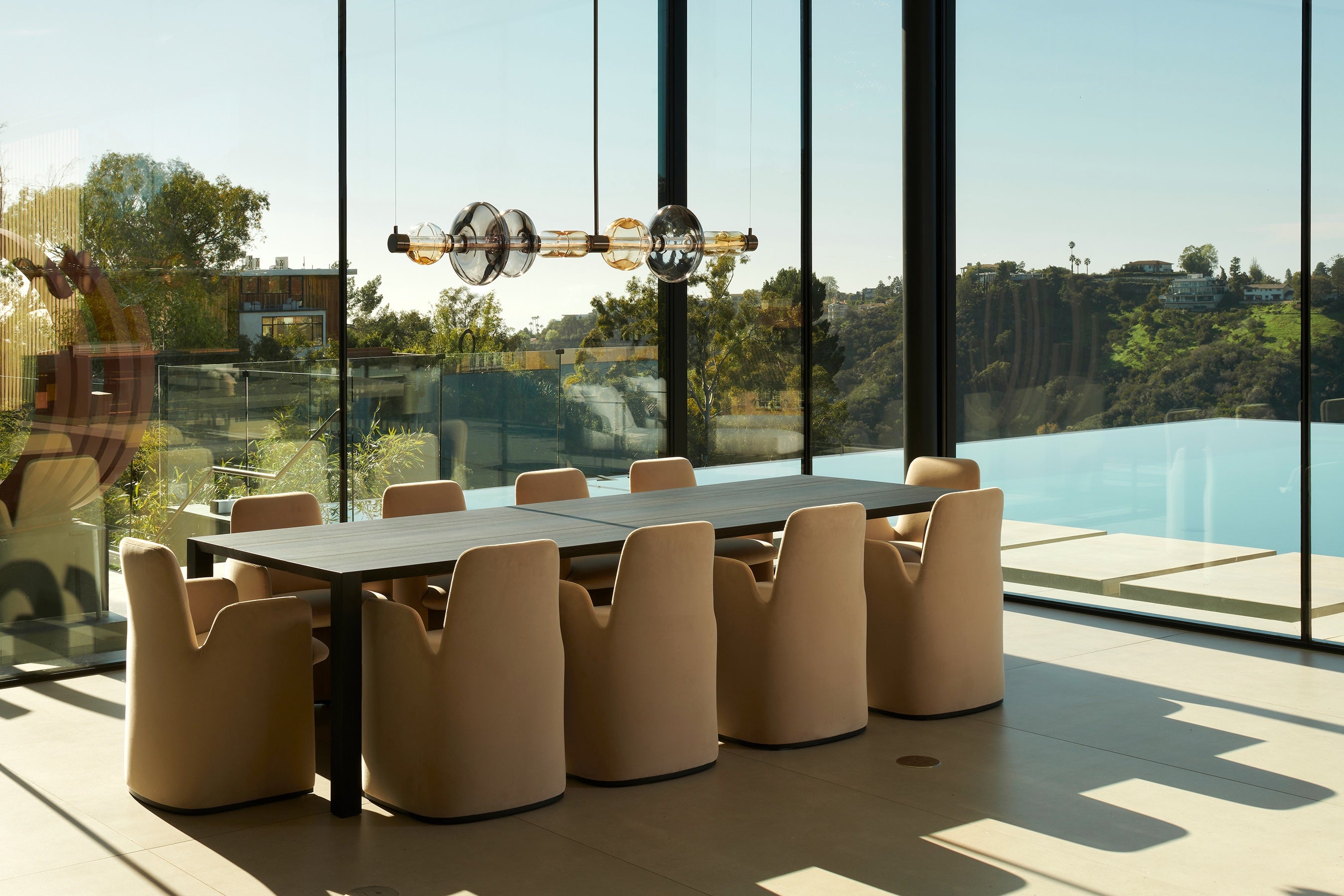 The Colombia-born, West Hollywood–based designer’s Gusto collection arranges geometries of blown glass into curious silhouettes that would not be out of place in the laboratory of a mad yet brilliant scientist—or the cozy, Arts and Crafts library of a contemplative poet. Cast in either clear glass with cloudlike swirls of white or gradient glass in seductive amber and smoky tones, the translucent forms are distinguished by handmade dimples that refract LED lighting housed in thin white acrylic tubes encased by larger transparent glass cylinders that run through the center of each piece. The astonishing concoctions appear to float as they diffuse omnidirectional light.
