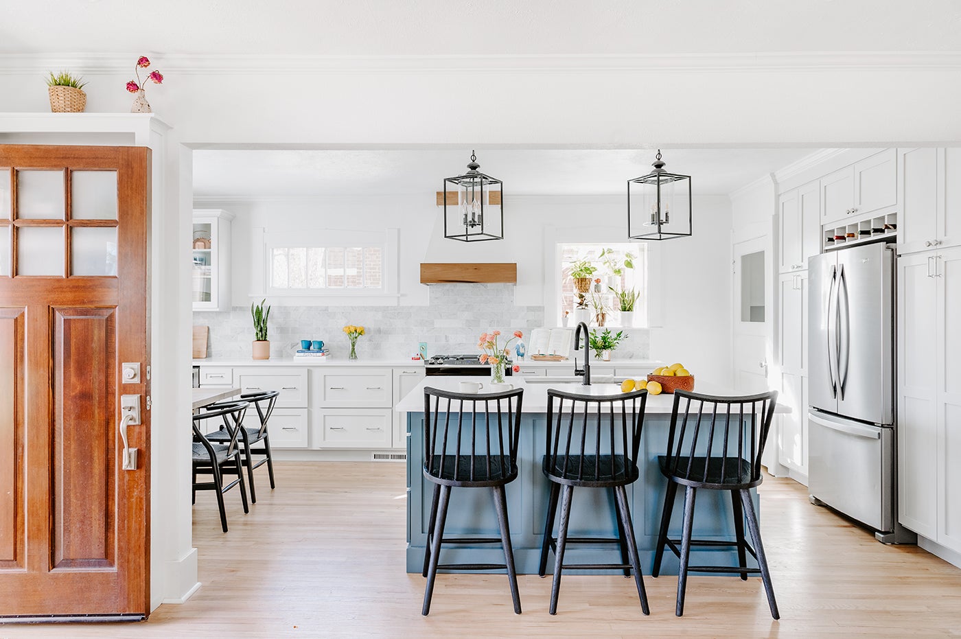 Homepage image: A blue kitchen island adds a swipe of color to this featherlight kitchen by Brayton Interiors | Kylie Fitts Photography