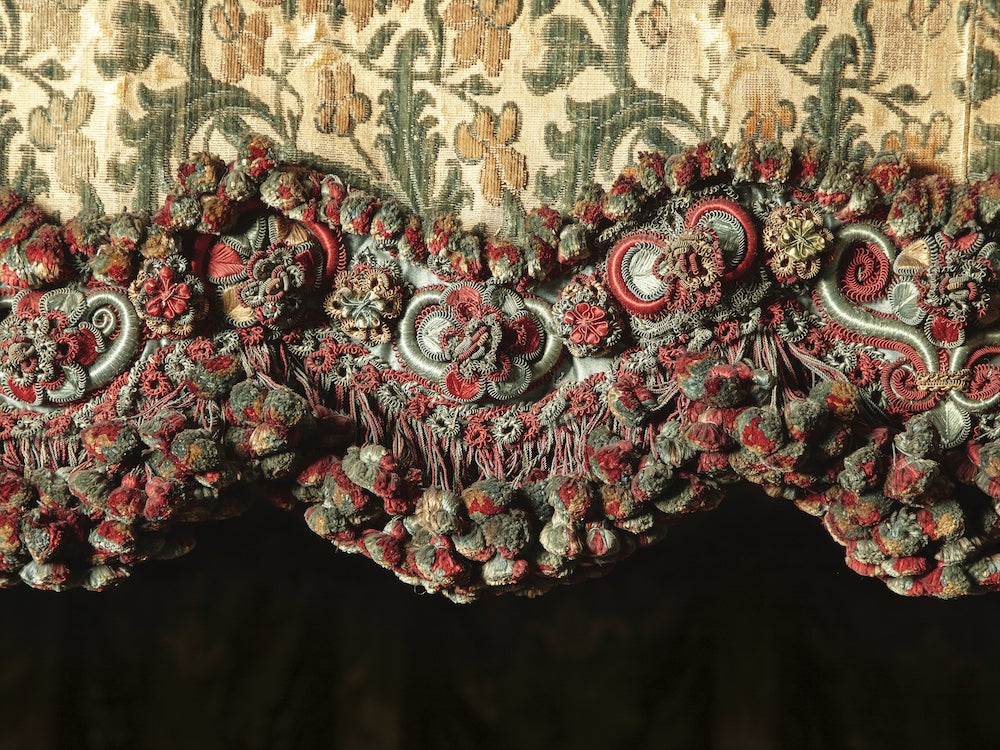 Homepage image: Detail of silk, vellum and wire ‘festoon’ fringe on Queen Elizabeth’s bed, c. 1685 (pages 56–57) | © National Trust