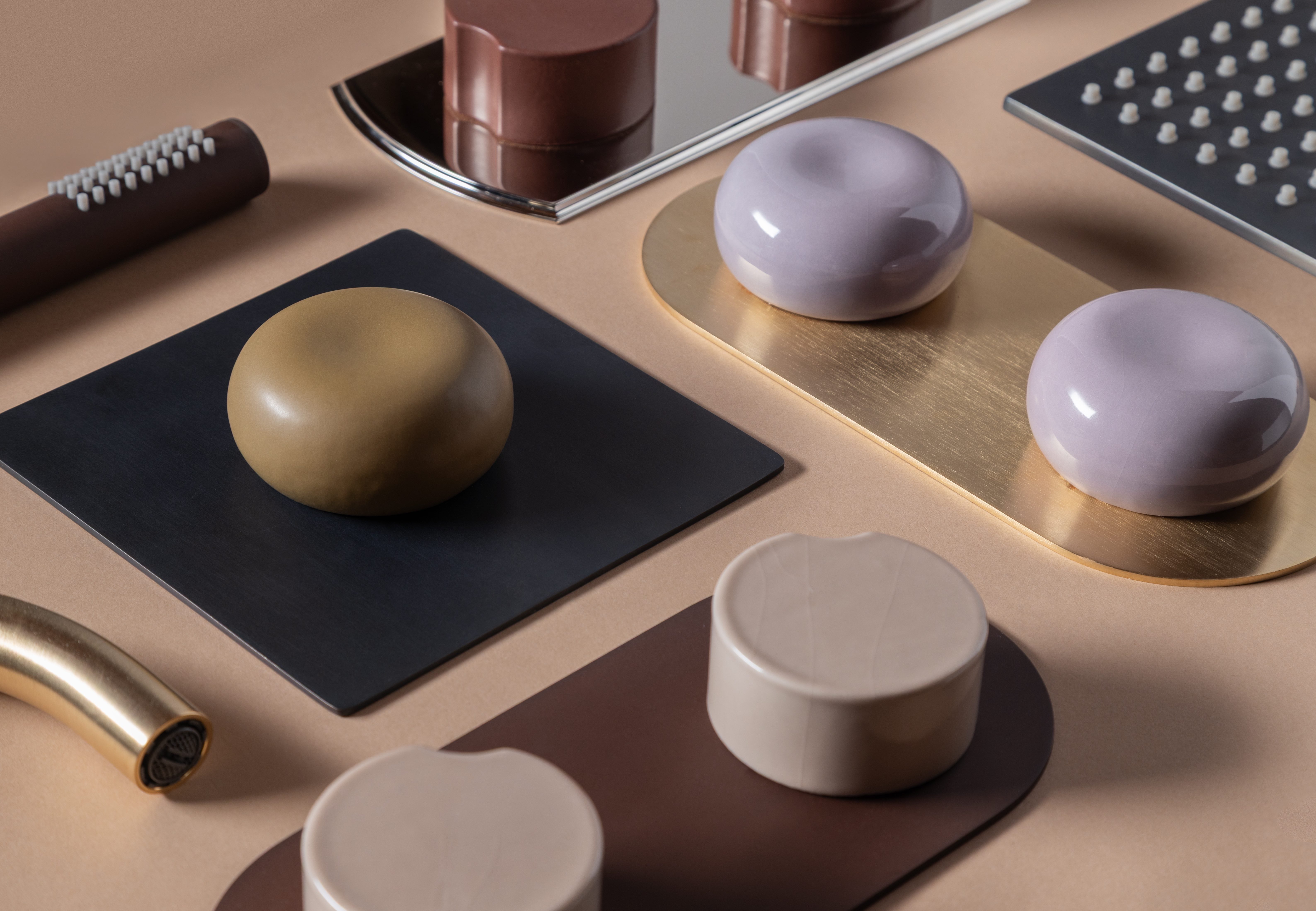 “There are so many potential combinations,” says Abel. “With 16 finishes and 16 glazes, that’s 540 combinations between your basic lavatory faucet and two-handle sink set. If you multiply by three for the three different handles in the Foundry collection, that’s math I can’t do quickly in my head, but it adds up to over 1,500 pairings.” In preorders, customers are experimenting with different color glazes for hot and cold handles, while minimalists might prefer a single large Pebble or Groove knob with a progressive valve that cycles from off to cold to warm to hot—another option. “Each looks like a sculpture,” he says. “A piece of art.”