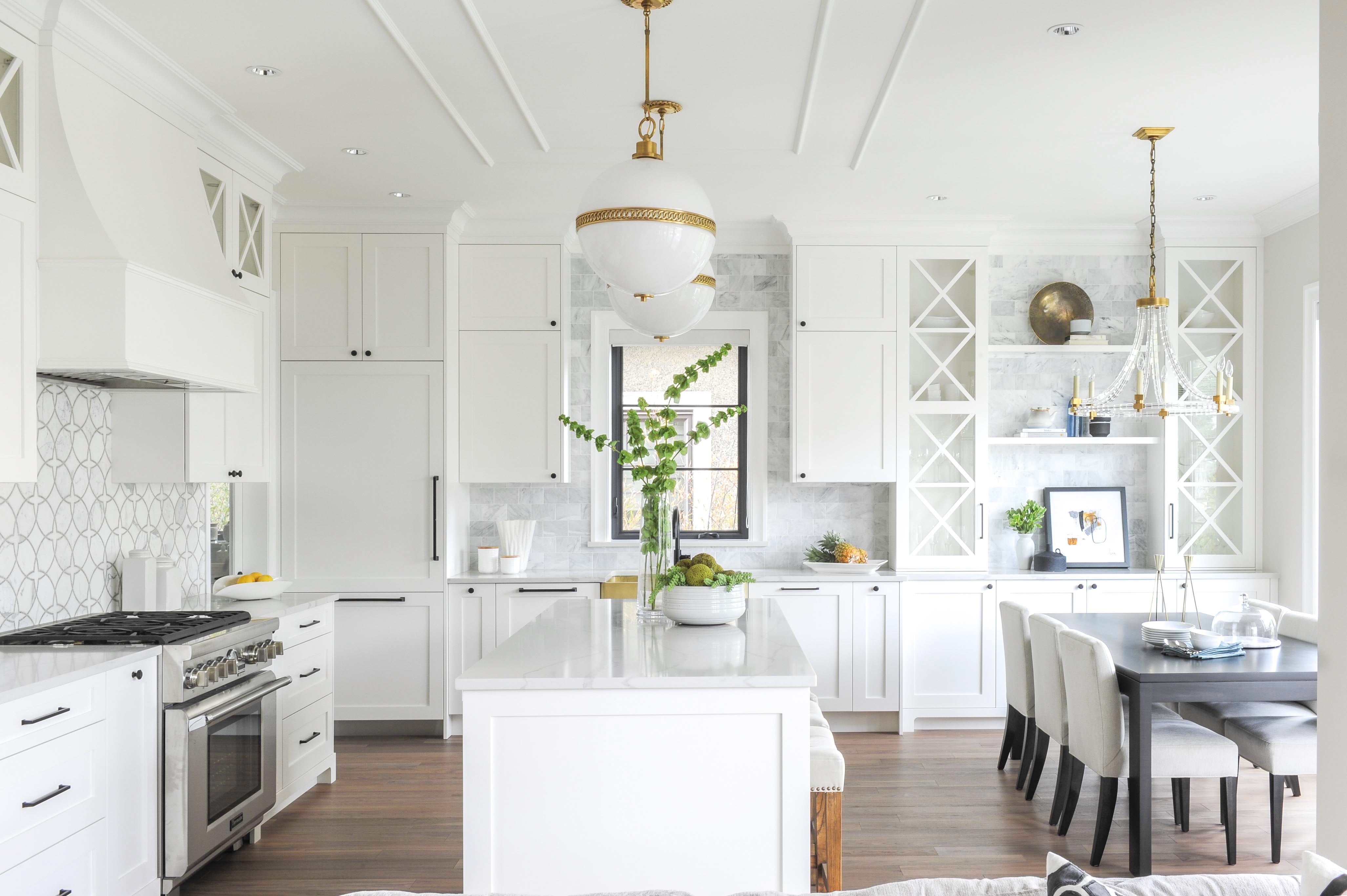 Homepage image: Gold accents enhance this bright, white kitchen by Victoria McKenney | Tracey Ayton Photography