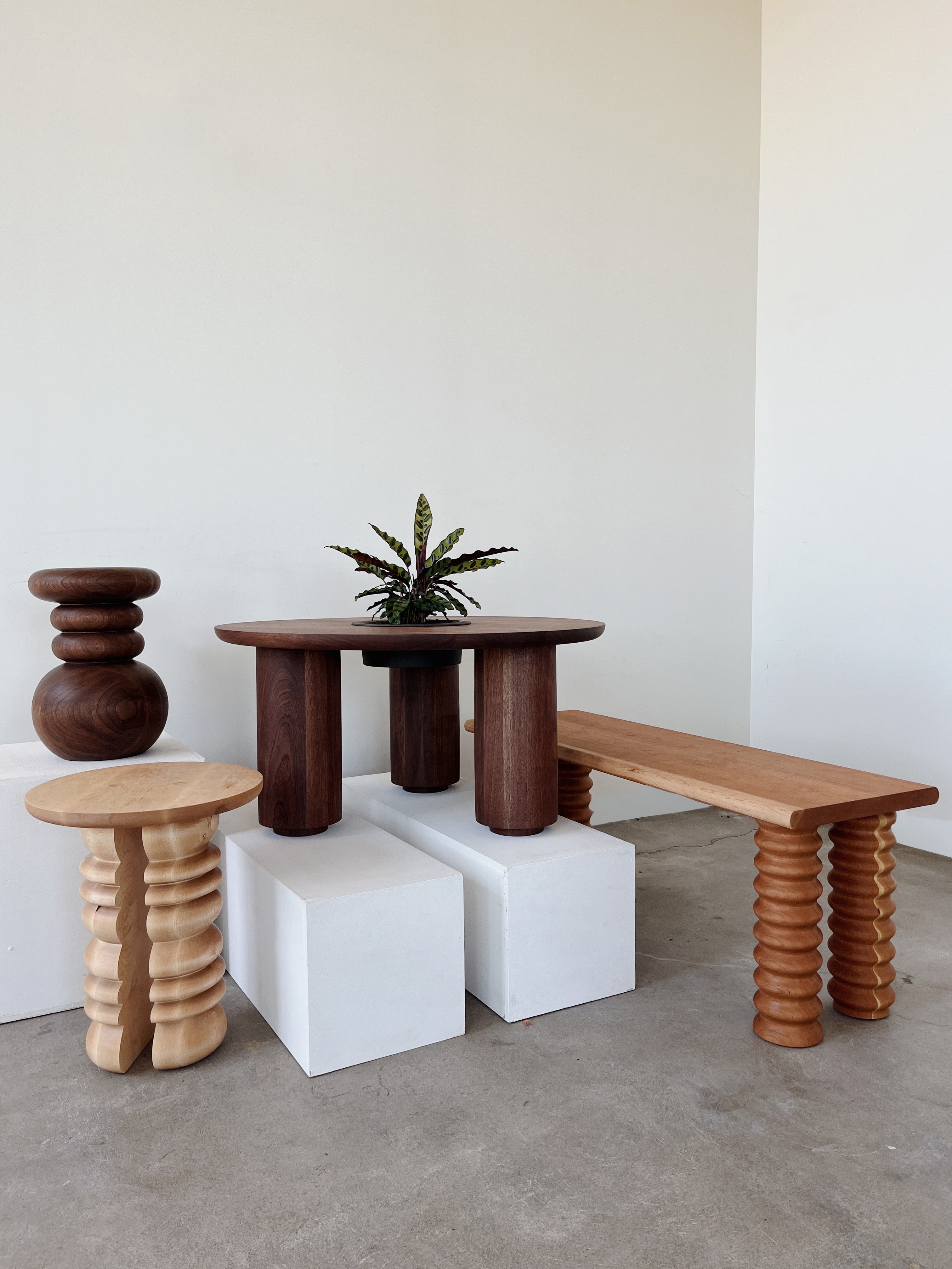 A brief stint working for a furniture maker—and having two entrepreneur parents—inspired her to open her own studio, and in 2019, Han Studio came to be. She started with smaller items like cutting boards and candleholders before eventually graduating to furniture with her debut collection last year, which she continues to develop. “My background is in sculpture, not in furniture making,” says Dausch. “I think that makes my work very unique, because it walks the line of furniture and sculpture, and I love that idea. It allows my customers to decide what they want my pieces to be. Personally, when I buy something for my house, I don’t want to be told exactly how it needs to be [used]. I think my work allows customers to [use the items as they like].”
