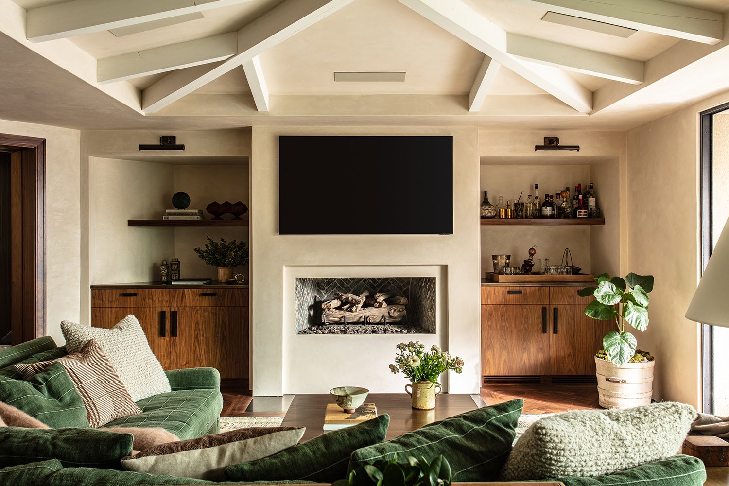 Homepage image: Studio Gutow designs the ultimate lounge-meets-entertainment space with plush green velvet and a wet bar close at hand | Michael Clifford