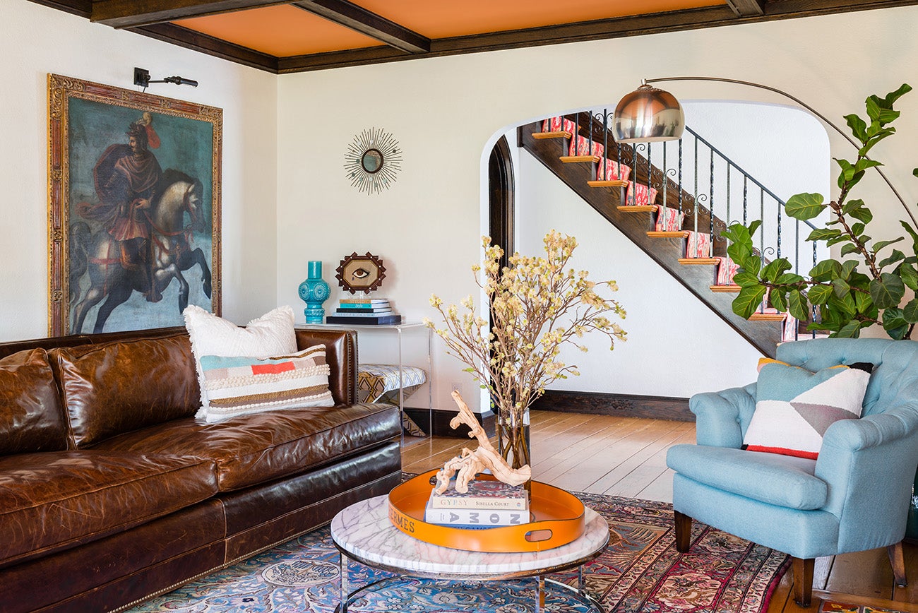 Homepage image: Noelani Zervas creates warmth in this living room with orange accents and a leather sofa | Jessica Delaney