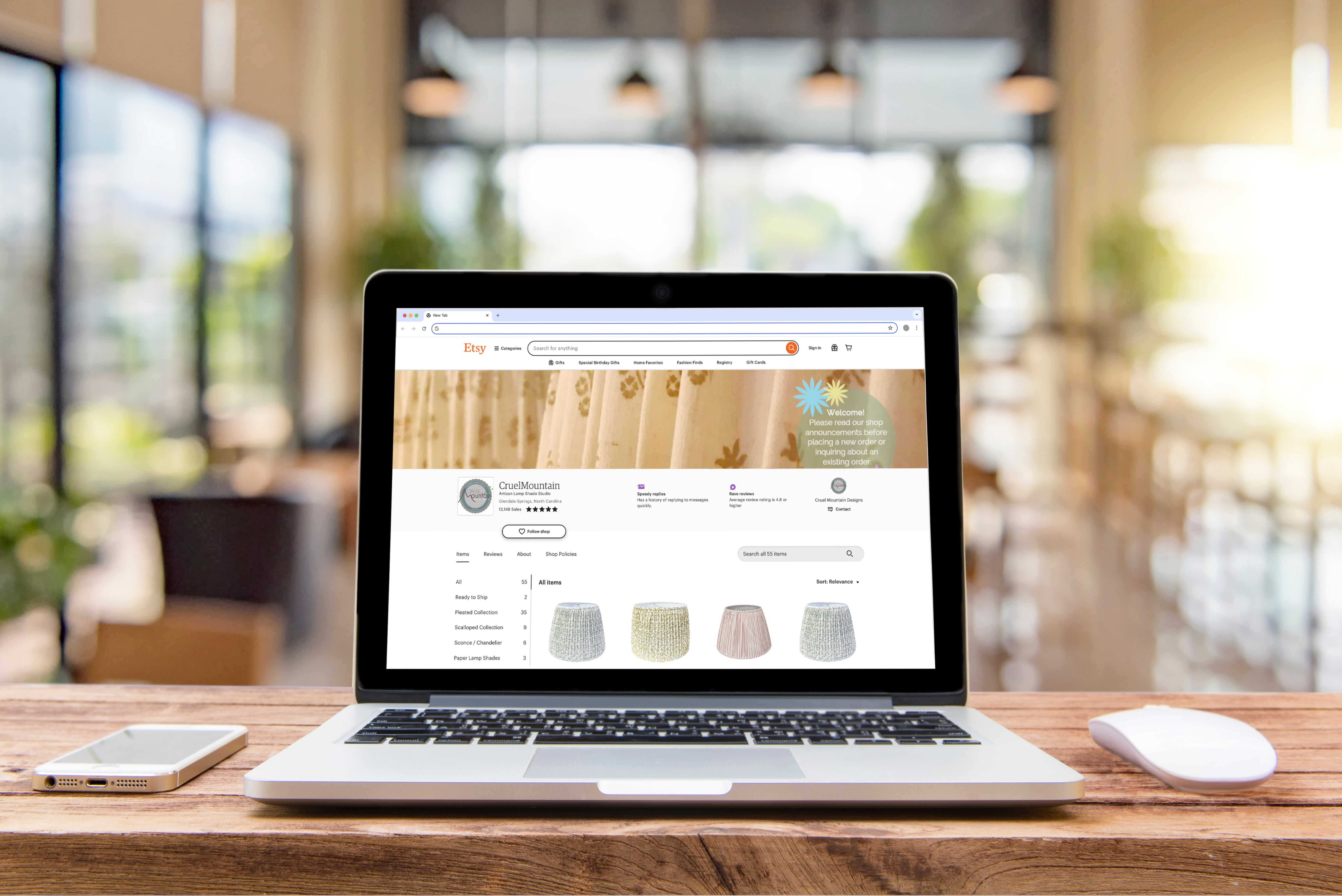 Etsy is well positioned to serve designers for that reason: It has become a platform where sellers can really lean into a niche. Take Carey Trudeau, a Woodstock, Connecticut–based decorator and maker whose Etsy shop PoshPlay specializes in French-style tufted cushions, or Lisa Carpenter of Cruel Mountain Designs in Glendale Springs, North Carolina, who makes lampshades by hand in designer fabrics. Vendors like these are able to home in on what they do well (and what sells), then tailor their production to meet the market’s demands. They also benefit from the way the site’s search functionality facilitates discovery and rewards specificity. When a designer searches for something like a “Les Indiennes fabric lampshade,” they quickly find the Cruel Mountain Designs Etsy shop and can place an order almost instantly.