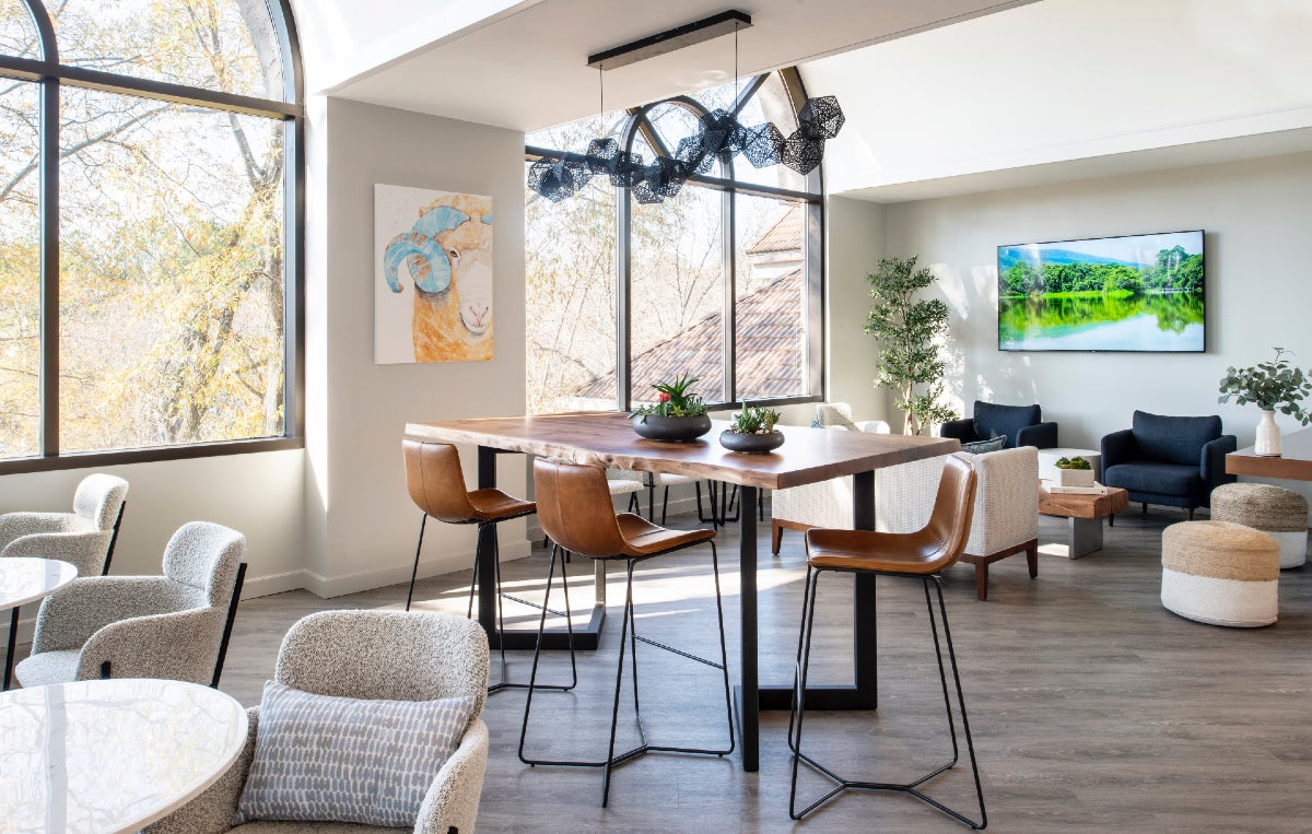 A lot of natural light, and an open plan and a welcoming environment. The architecture itself is curved, so you’re walking into a curved line, which is more restful and peaceful than a straight line. There’s a soffit that curves, and the reception desk curves. The first thing you see are natural elements: that live-edge table, leather, glass, granite and all these natural materials. That’s a way to put people at ease; those are all biophilic design elements.