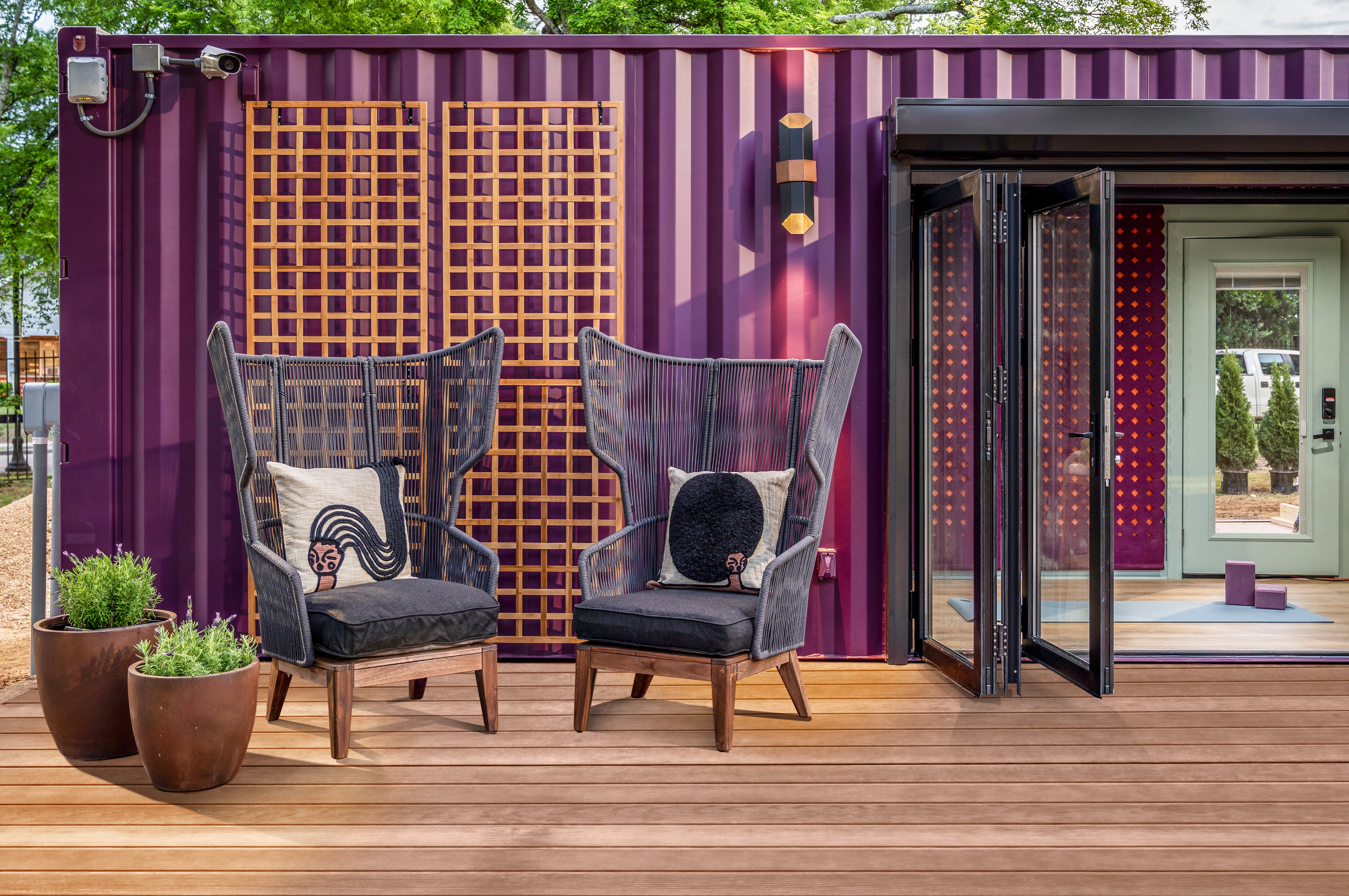 Each pod is housed within a repurposed shipping container, which was developed by Chicago-based modular construction company S.I. Container Builds and re-imagined by Powell and Saleem from the inside out. The size constraints of each pod (the smaller of the two is 20 feet by 7 feet, while the larger is 40 feet by 7 feet) meant the pair had to be intentional about the use of each space. They decided to craft the larger pod with physical activities like yoga, designing accordion-style doors to expand the pod’s square footage into the outside area, while the smaller space is geared toward rest and relaxation. Both are imbued with a similar design scheme, meant to evoke joy by incorporating the vibrant use of color that Powell and Saleem have perfected individually in their past work.