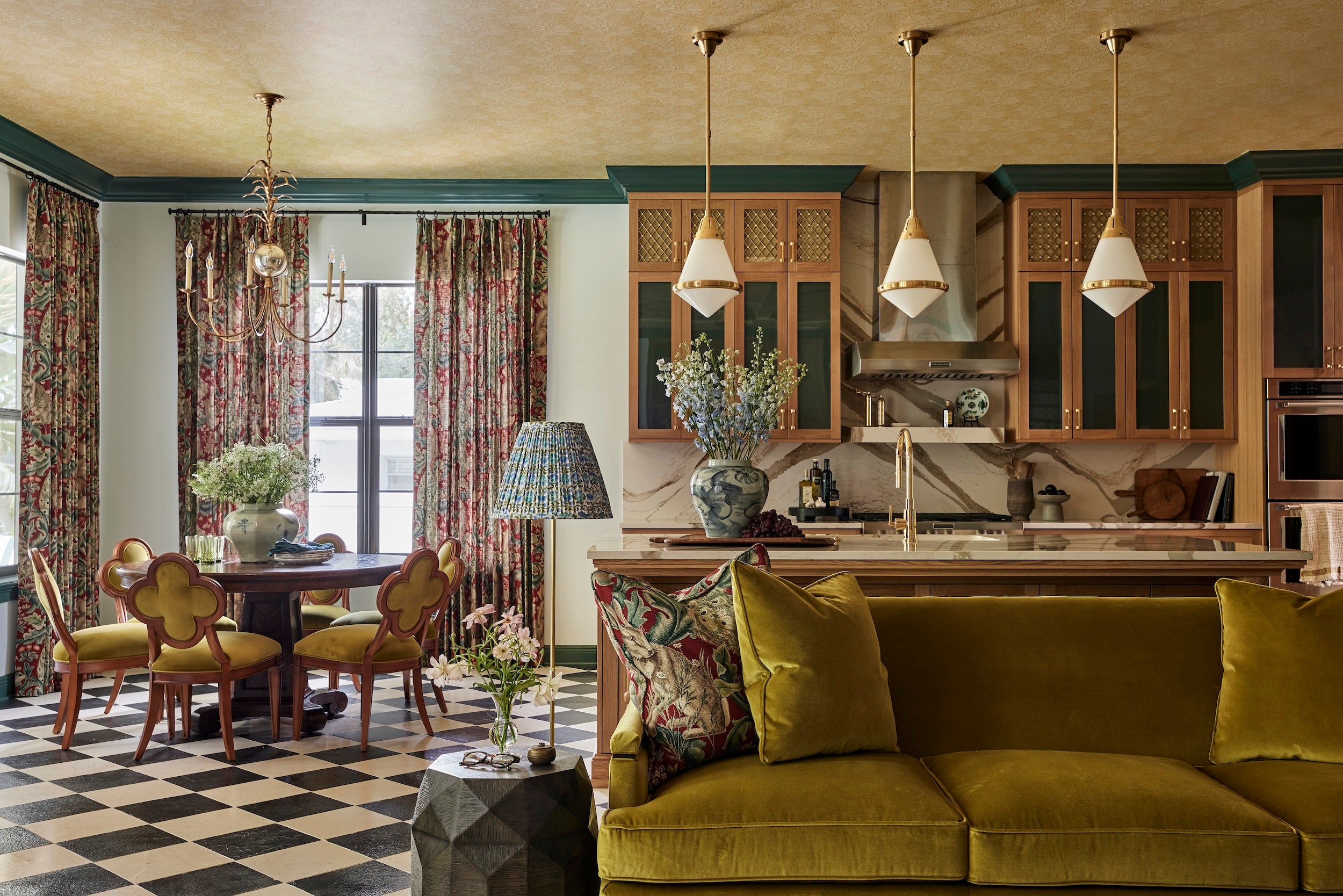 “Our design aesthetic? Bold, colorful, luxurious and inviting. We work with materials that bring real depth and richness to a space: stone, silk, velvet, layered prints—all chosen to add warmth and a sense of opulence. But design, for us, goes beyond materials and color palettes. It’s the sum of experiences, a way to express the lives we’ve lived and the perspectives we’ve developed along the way. Staying open and curious, we’ve found that each experience shapes our approach to design, adding depth to our work.” —Charlotte Moco and Dan Hano, Hanomoco Design, Berkeley, California