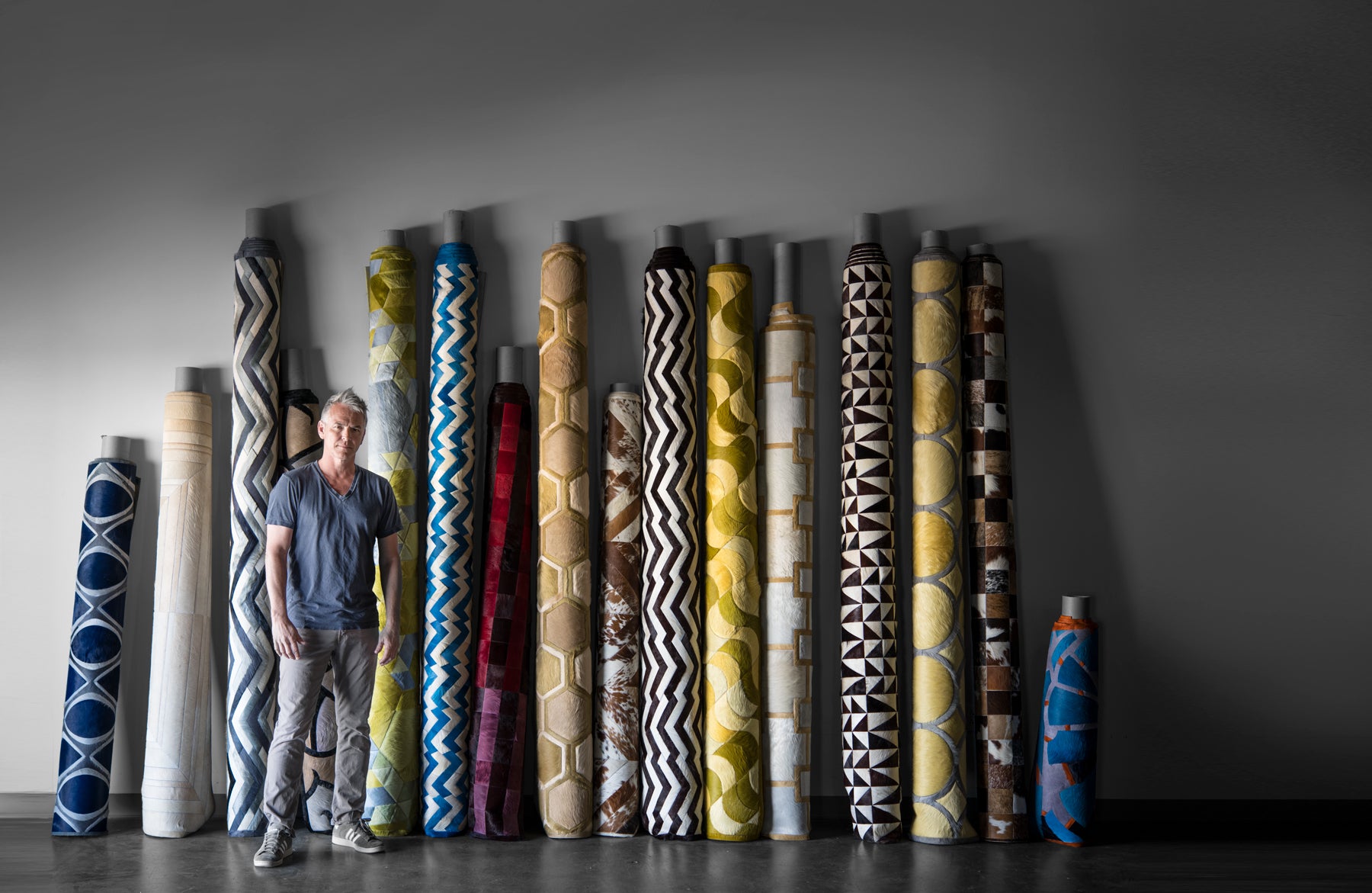 Over the next decade, Bunting essentially single-handedly created a new category of high-end floorcovering. Often customized, his hide creations could be monochromatic and simple, or wildly colorful and inventive, ranging from intricate florals to re-creations of abstract art. Using a surprisingly high-tech process (it involves digital modeling and an inventory algorithm), Bunting’s factory can produce hundreds of pieces a month. Though he says he began noticing similar products appear on the market around 2010, Bunting has built a significant competitive advantage of quality and scale. “You could replicate what we do if you wanted to do a few of these a month,” he says. “But if you want to do a hundred, or five hundred, it’s a whole different ballgame.”