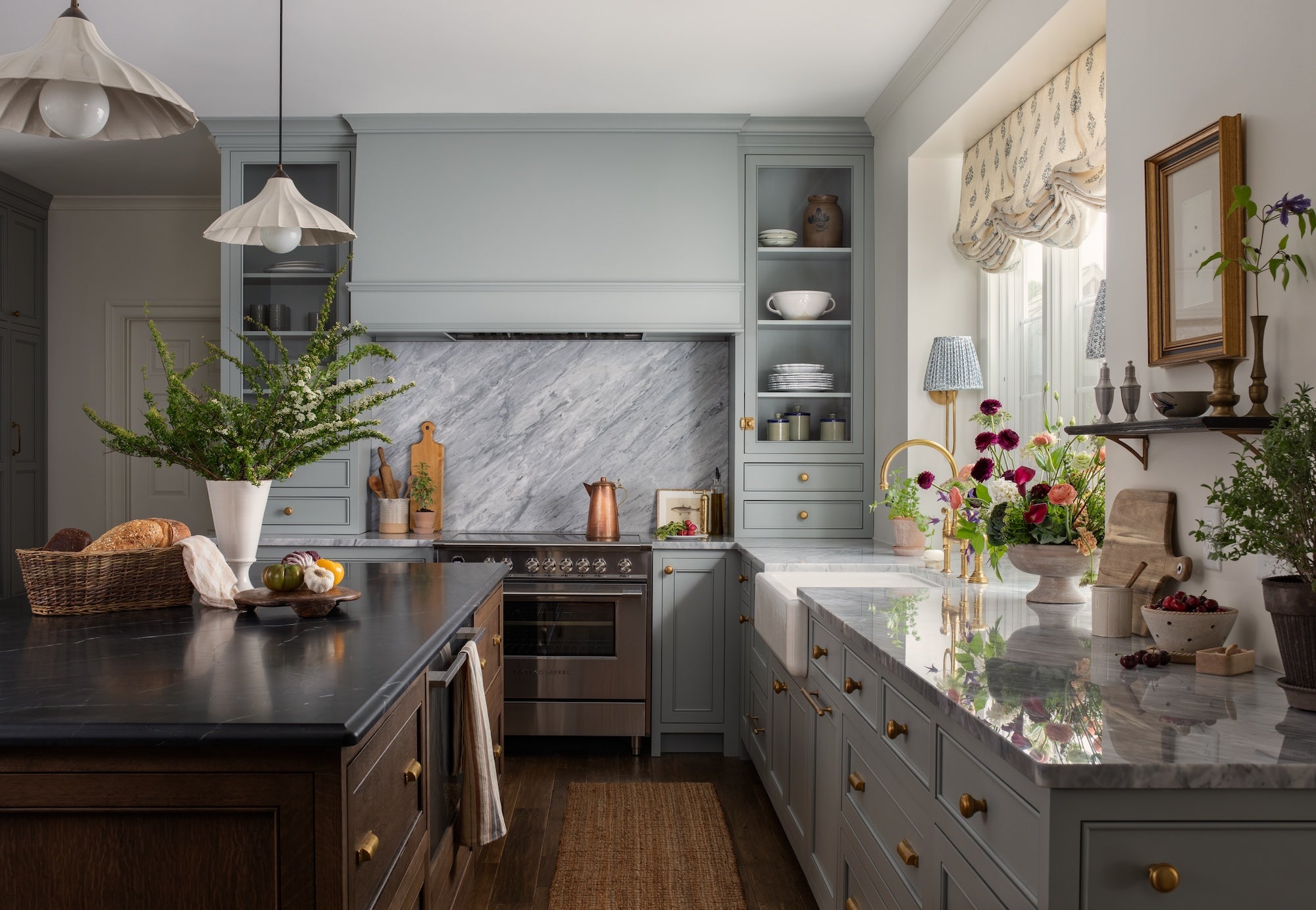 A lot of times, our clients go for these beautiful-in-their-own-right ranges, so we’re often designing around that. But I love the fact that this was a Wolf stove that they knew they wanted. It feels functional, but also beautiful in the sense that it’s functional, if that makes sense. It works with everything, without needing to be overly pretty. And then it’s funny how the smallest things—like the pleated shade on the sconce, or the gathered, relaxed Roman [shade]—add the attitude and the casual beauty, keeping it from feeling like just a task-oriented space.