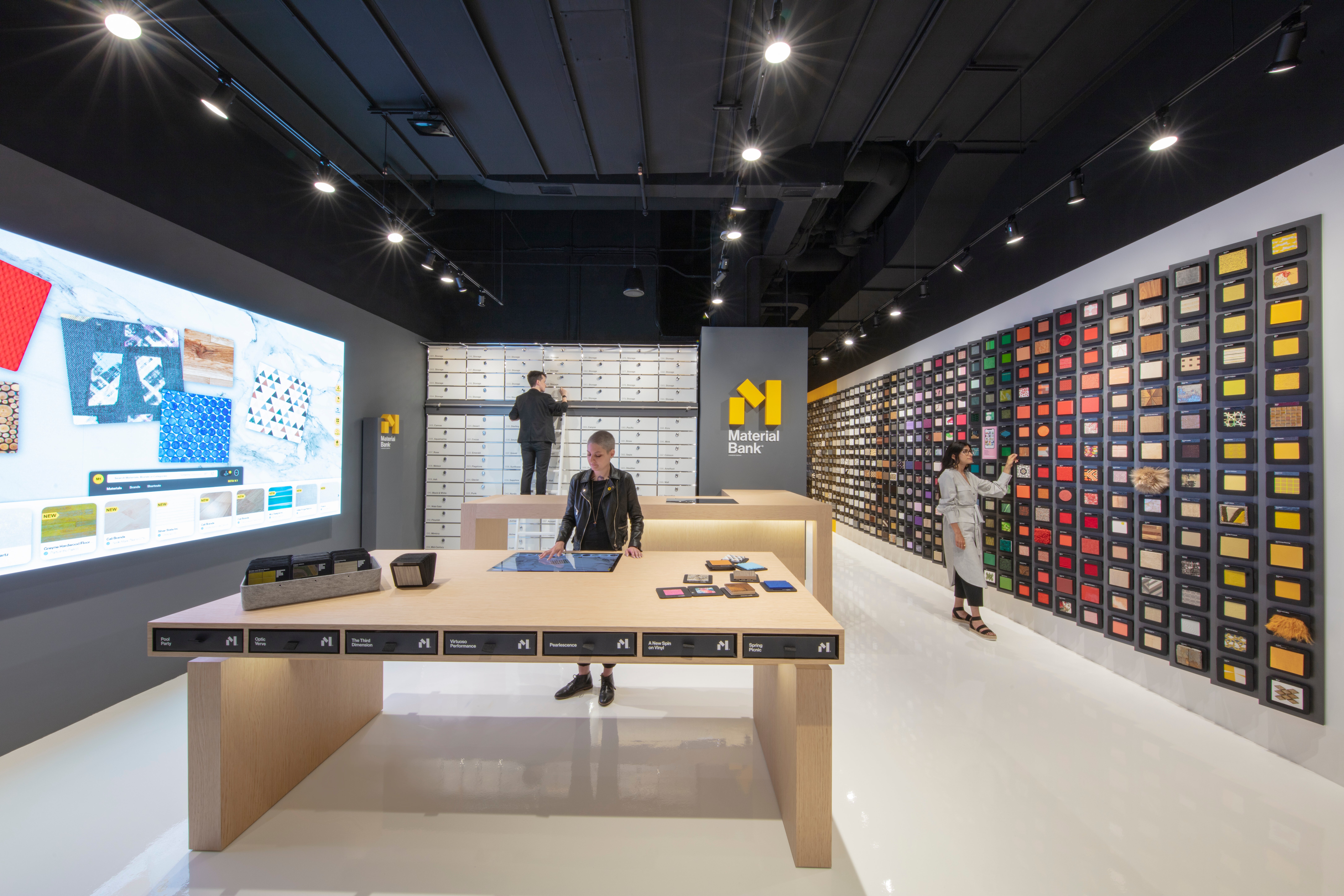 The new outpost features a wall adorned with Material Bank’s new Smart Swatch system, a QR-code-enabled swatch, affixed magnetically on the walls (with thousands more stored in a wall full of drawers, organized by color, material, and theme), that provides effortless access to information like available colorways and a suite of product specs. The space also features the Material Desk, a new interactive touchscreen that helps architects and designers create palettes with renderings of samples from the Material Bank library—all of which can then be easily ordered for the platform’s signature next-day delivery.
