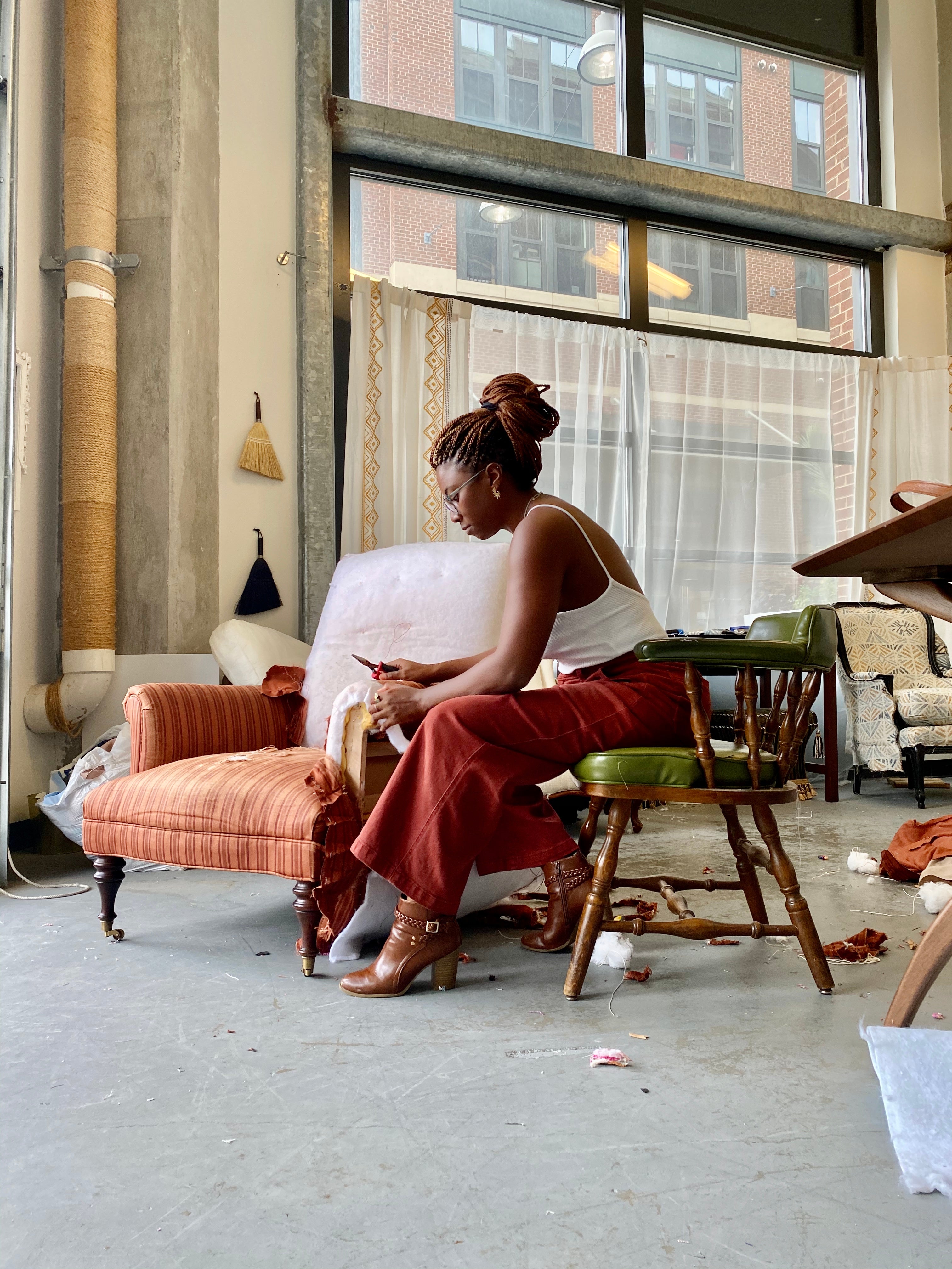 Homepage photo: Nicole Crowder at work upholstering a chair | Courtesy of Nicole Crowder
