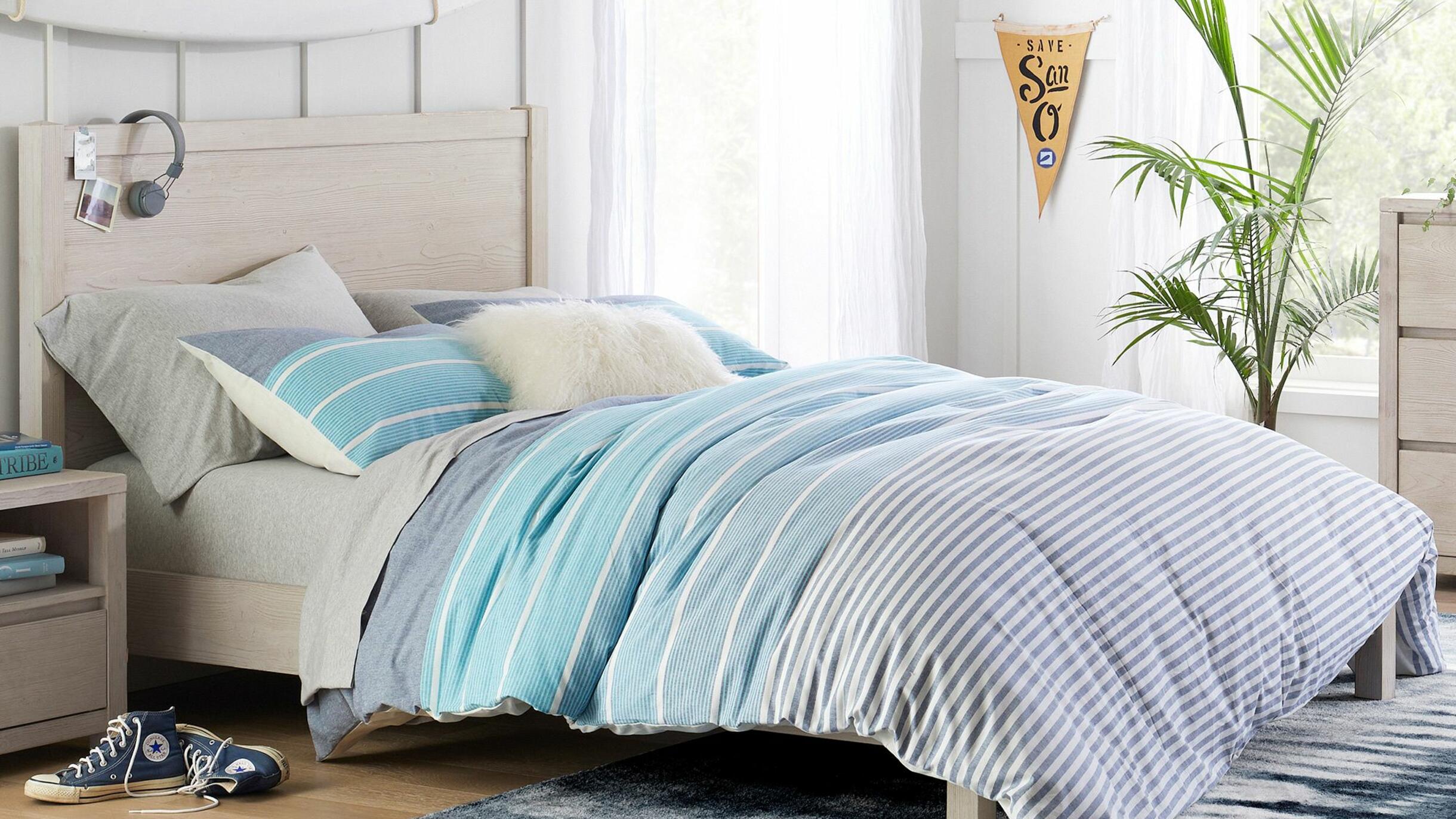 Pottery Barn Teen partnered with the Surfrider Foundation, an environmental nonprofit focused on ocean preservation, for a collection of eco-friendly decor items. The collaboration includes blue-toned bedding, decor, rugs, wall murals and bedroom furniture, featuring pieces crafted from responsibly harvested wood and recycled fishing nets.