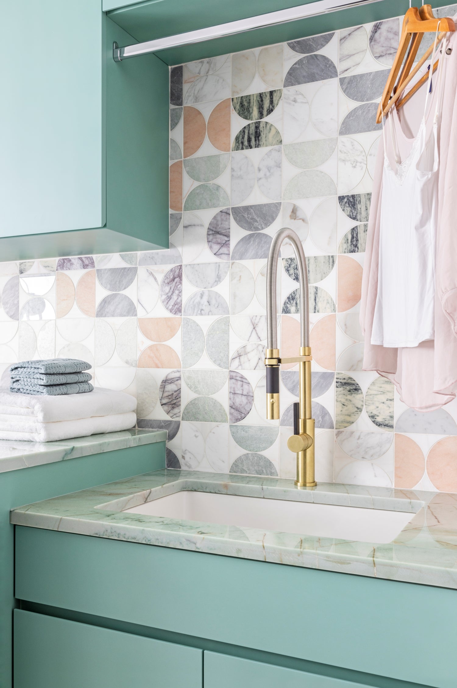 Crafted in a mix of richly veined stones, the Moon Cosmati Light WJ Mosaic at Artistic Tile boasts a bisected circle pattern that’s begging to be employed in a petite powder room or as an art deco–inspired kitchen backsplash.