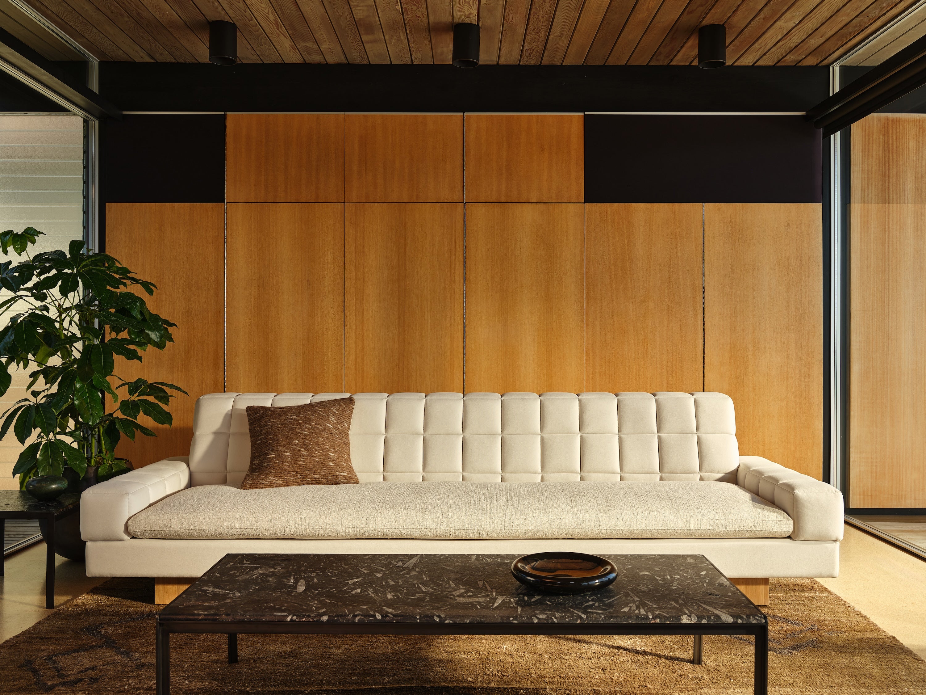 CB2 reunited with musician Lenny Kravitz for a third collaboration, this time blending influences from European modernism and relaxed Malibu style. Available in a palette of warm neutrals, the assortment emphasizes tactile elements through woven leather seating, Danish cord stools, twill upholstery and Breccia marble tables.