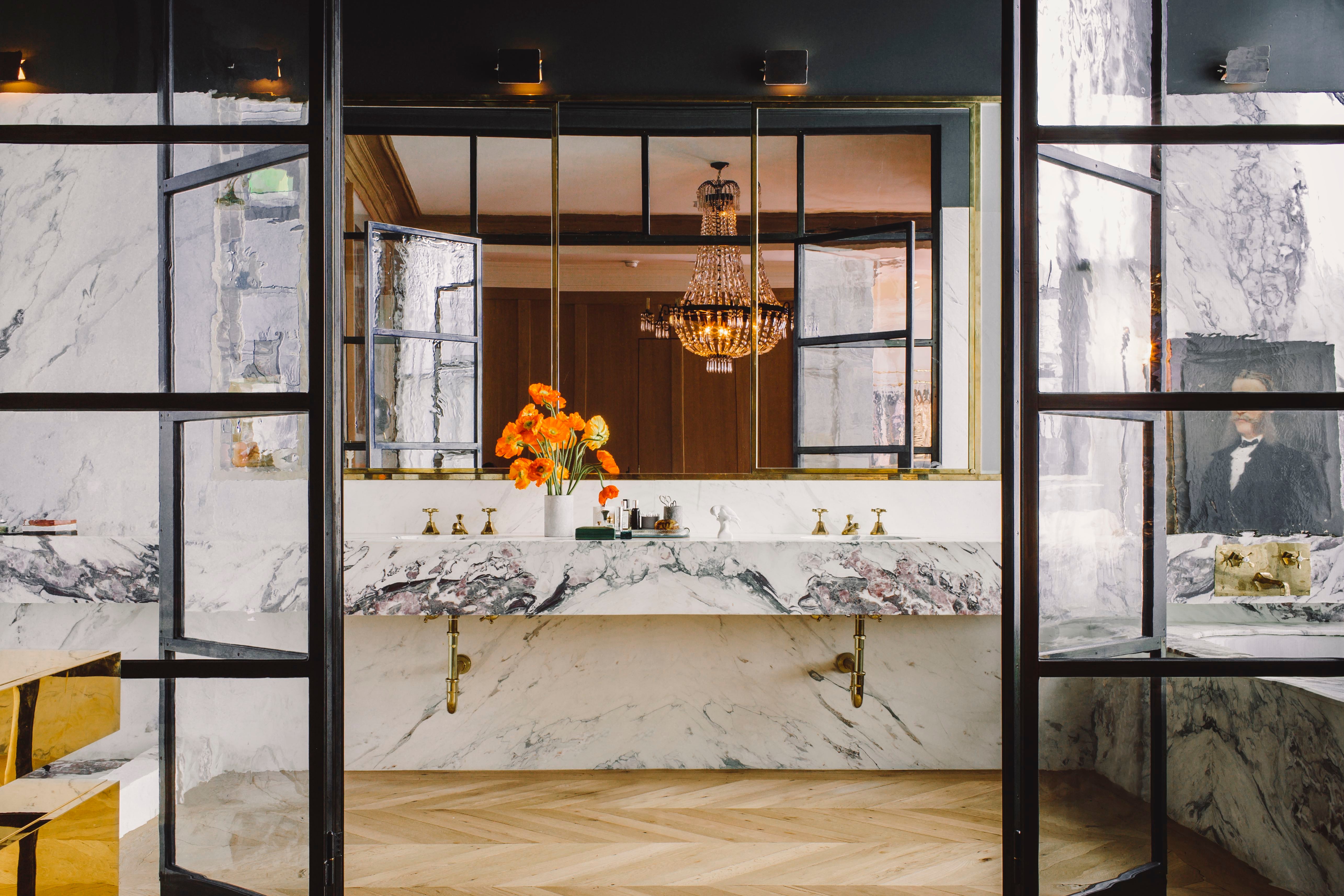 Homepage image: A main bathroom designed by Meyer Davis Studio featured in Splendor of Marble | Bryan Derballa, courtesy of Rizzoli