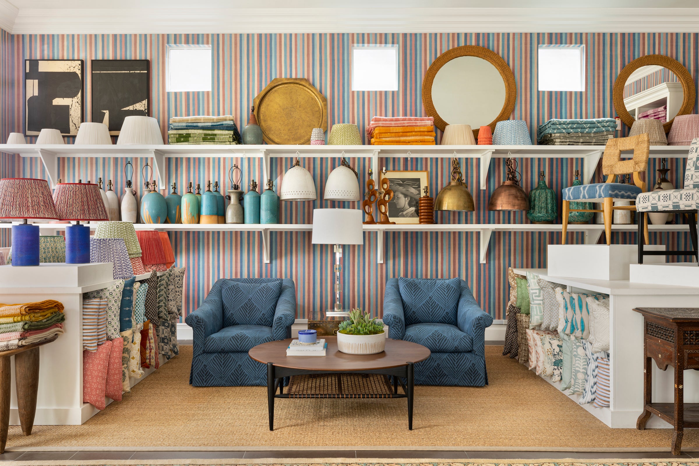 Homepage image: The front room of the shop with Peter Dunham Textiles Jacob’s Stripe grasscloth on the wall | Aimee Mazzenga