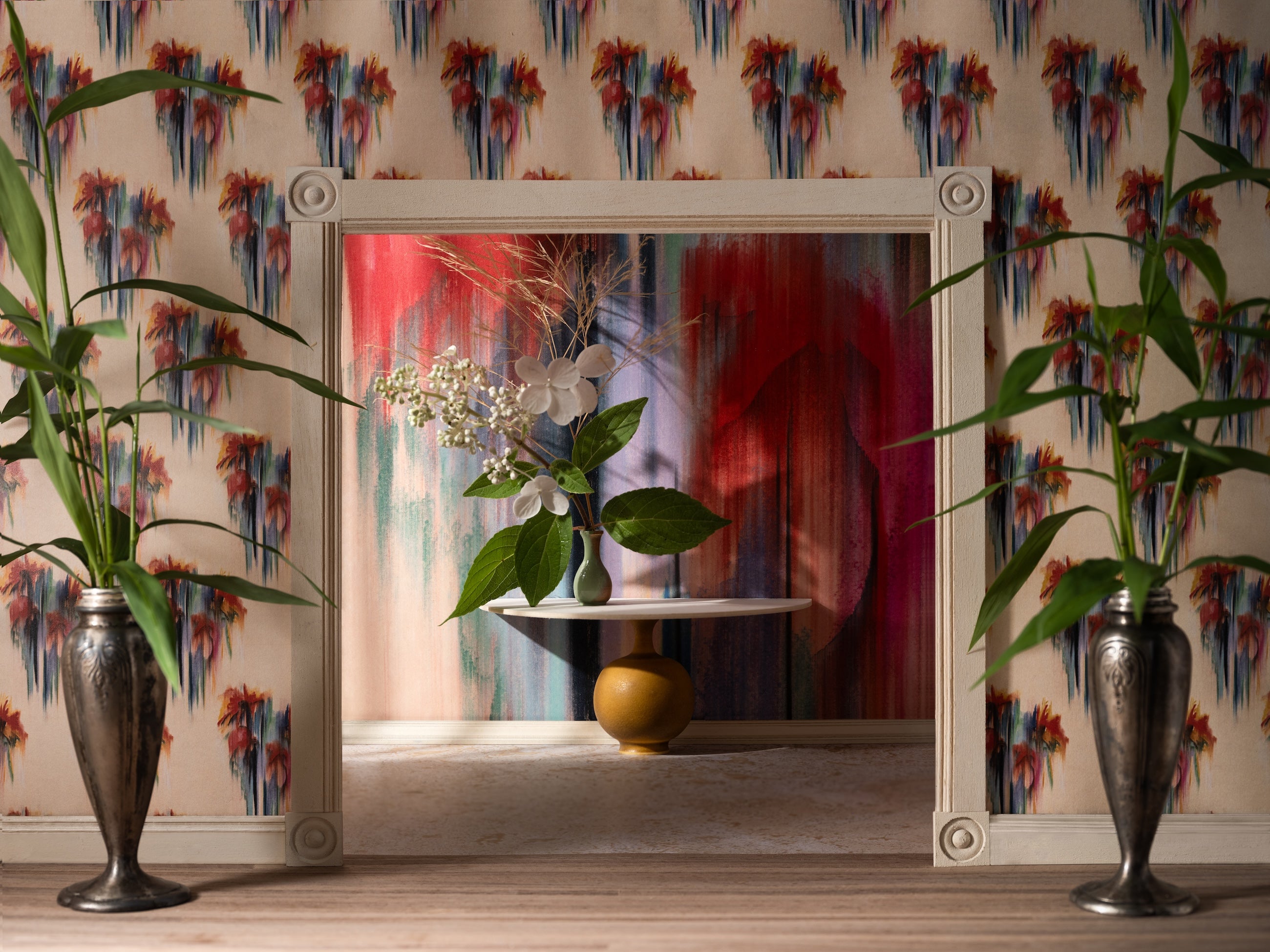 When it comes to wallpaper lines, many independent brands have found that the most budget-friendly way to show scale is to Photoshop the individual SKUs onto digital images. So a wallpaper brand might buy an inoffensive Adobe Stock image, or have a photographer take a simple picture of a white wall with some versatile furniture positioned in the corner, and then superimpose different wallpaper designs onto that image. Danica Andler, the creator of custom wallpaper line AND, would alternate between the Photoshop technique and tacking up her wallpapers in the homes of friends and family in order to show them in situ. “I had fun doing that, but it was always a corner or one wall—I wasn’t able to display my work on a large scale,” says the Los Angeles designer. “And the Photoshopping was just so unsatisfying. Like, I’m making something interesting and tangible, and then I’m dropping it into this uninspired environment. I’m really thankful that the technology exists to do that, but I was starting to feel like I needed to put my handcrafted wallpaper in a handcrafted environment.”