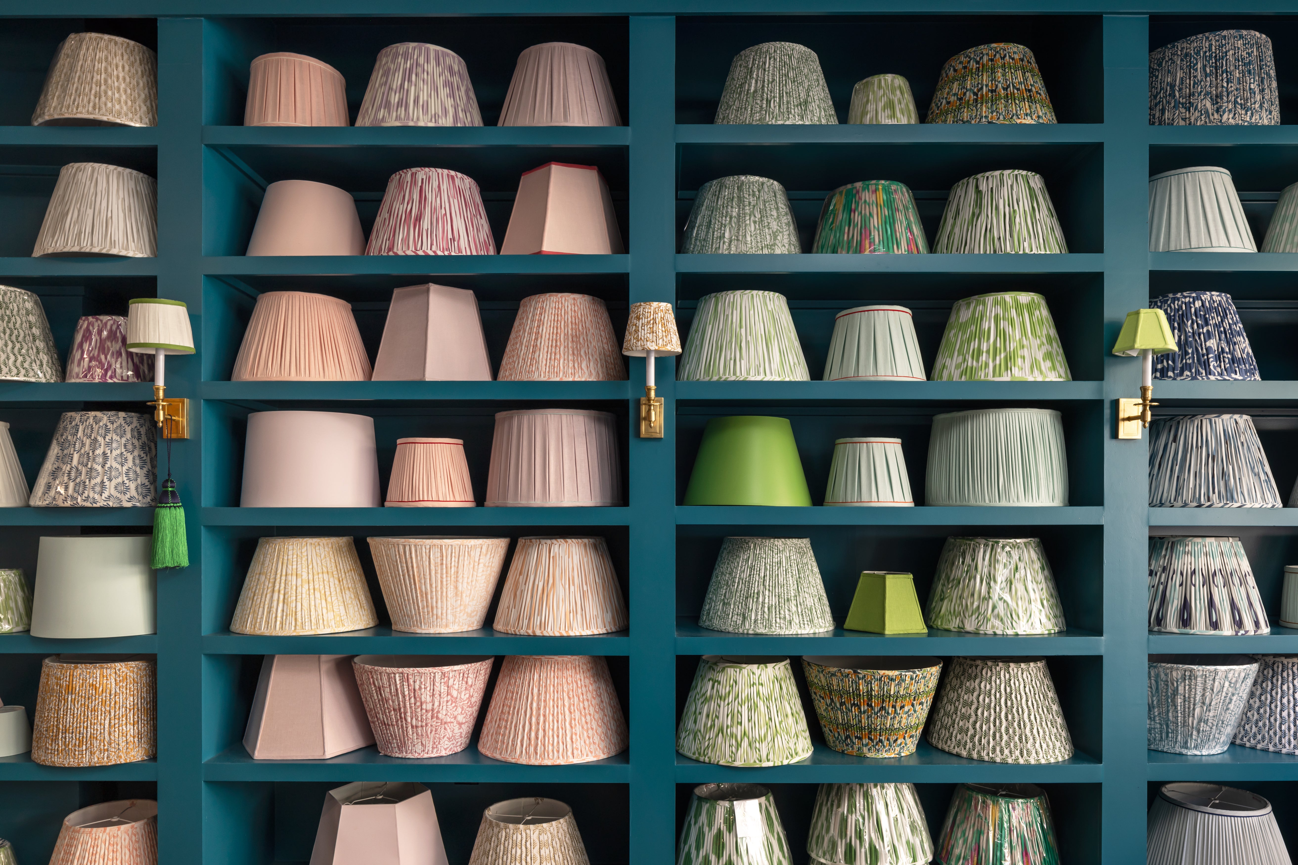 The sisters don’t stop at product customization—they also cater to each store visitor, offering them a glass of wine or coffee while they collect fabric samples and explore the endless shelves of shades. “We have the football game on the television; we have benches for the men to sit down and have a beer while their wife is looking at lampshades—or vice versa,” says Ashton. “It’s been very well-received because there’s nothing like it. It underscores the need for better lampshades around the country.”