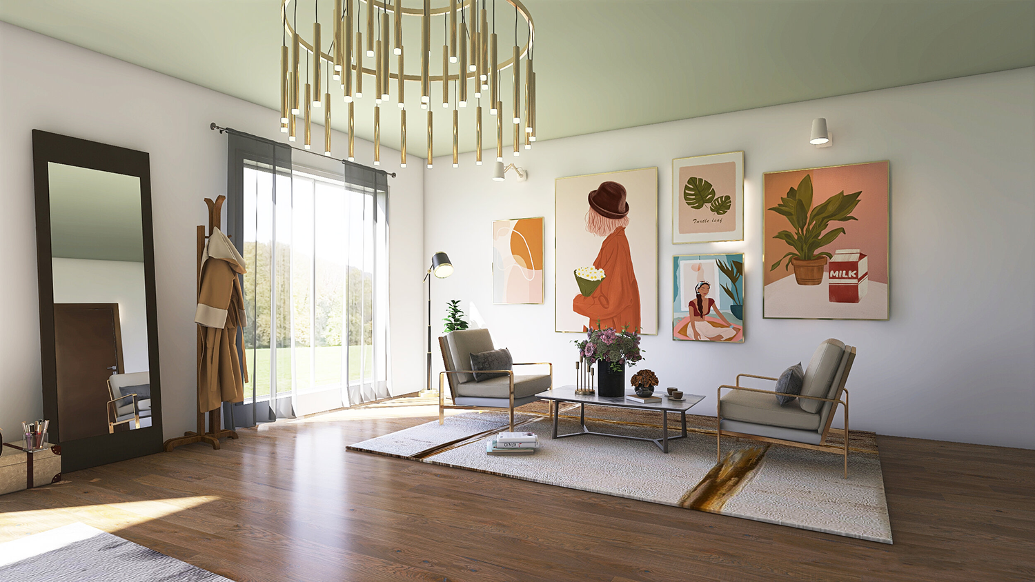 Homepage image: Meera Bedi uses a colorful gallery wall and statement lighting to create an inviting lounge space | Courtesy of Meera Bedi Designs