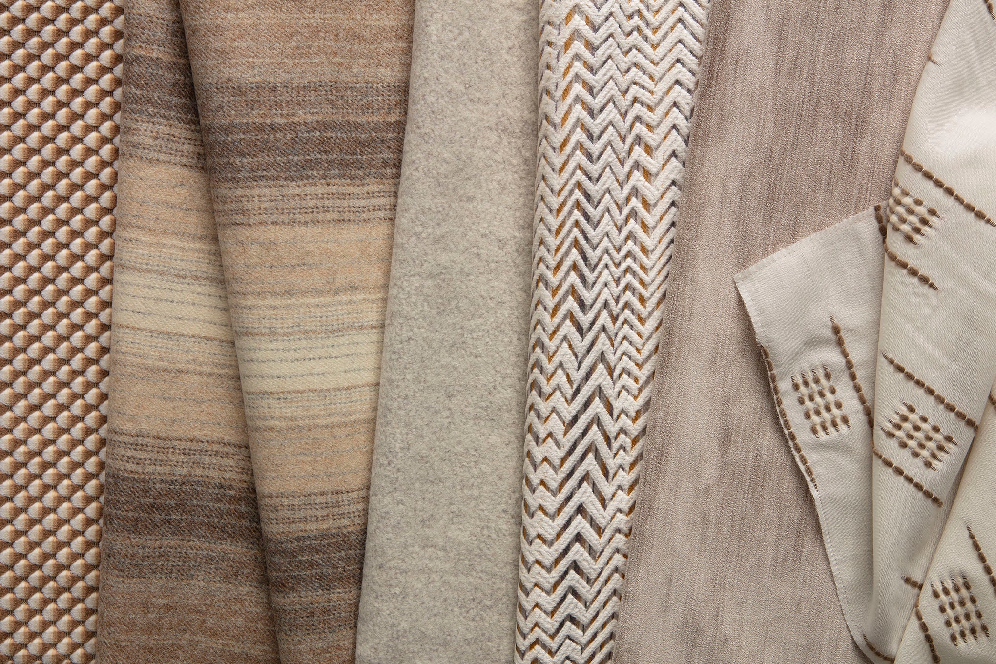 Homepage image: Pollack’s fabrics emphasize innovative pairings of yarns and unique finishes that give them a soft, luxurious hand. Styles from left: Cha Cha, Wool Horizon, Relax, Flicker, Conjure and Mantra | Courtesy of Pollack