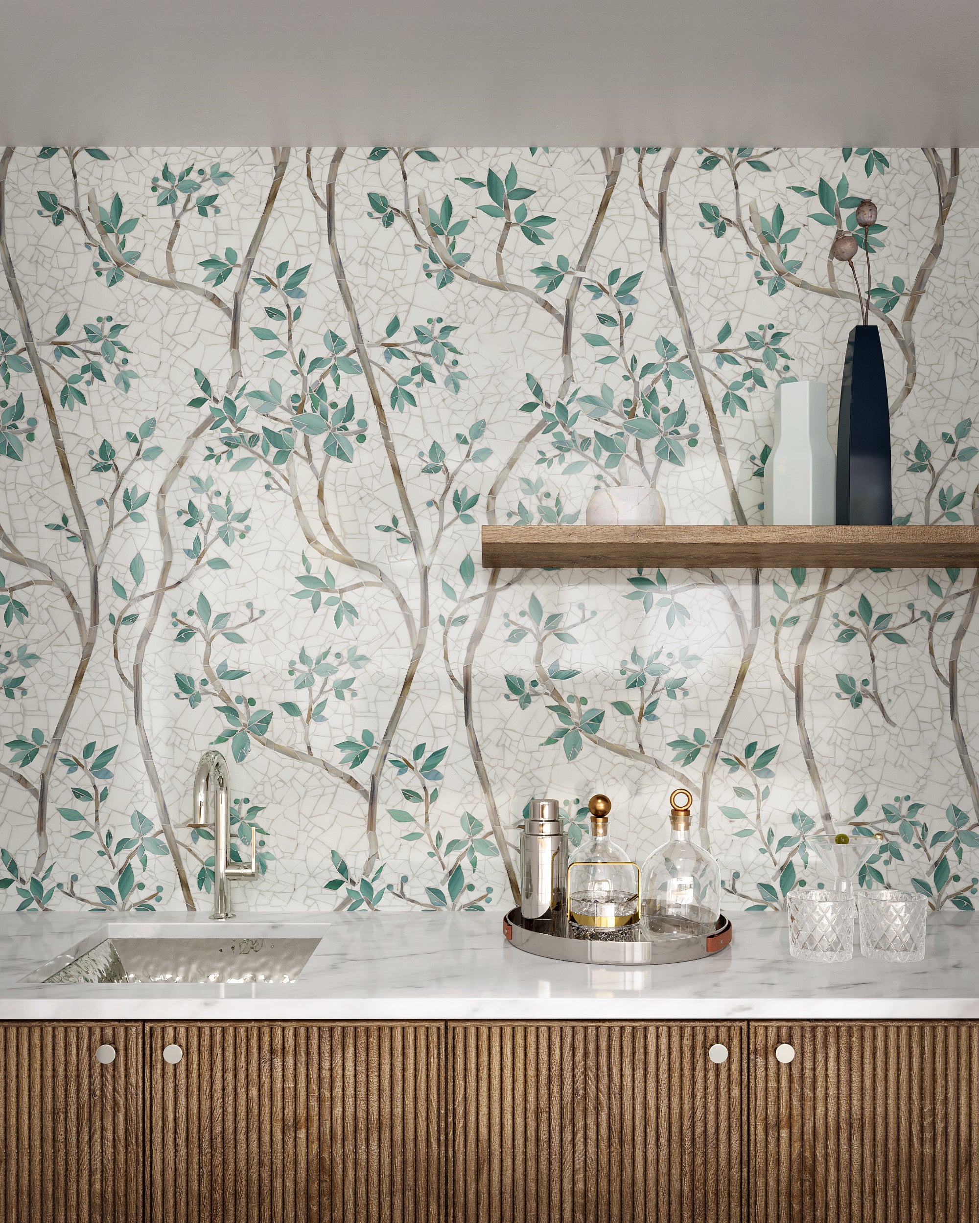 To hand-craft the collection, artisans in the United States employed pietre dura, a decorative technique perfected during the Italian Renaissance that creates complex textural patterns through the placement of small marble pieces in a multitude of colors. Eutopia features fragments of cut glass as its medium instead, inlaid to form the elaborate botanical repeats of each motif. An almost imperceptible grout line allows for a continuous application that appears nearly seamless, no matter what size the space. “You can feel that the mosaics are hand-set. It’s really bringing old-school craftsmanship into the home again in the most modern way. And the use of glass is amazing because you get this depth, you get this sheen, you get such luster,” says Bullard.