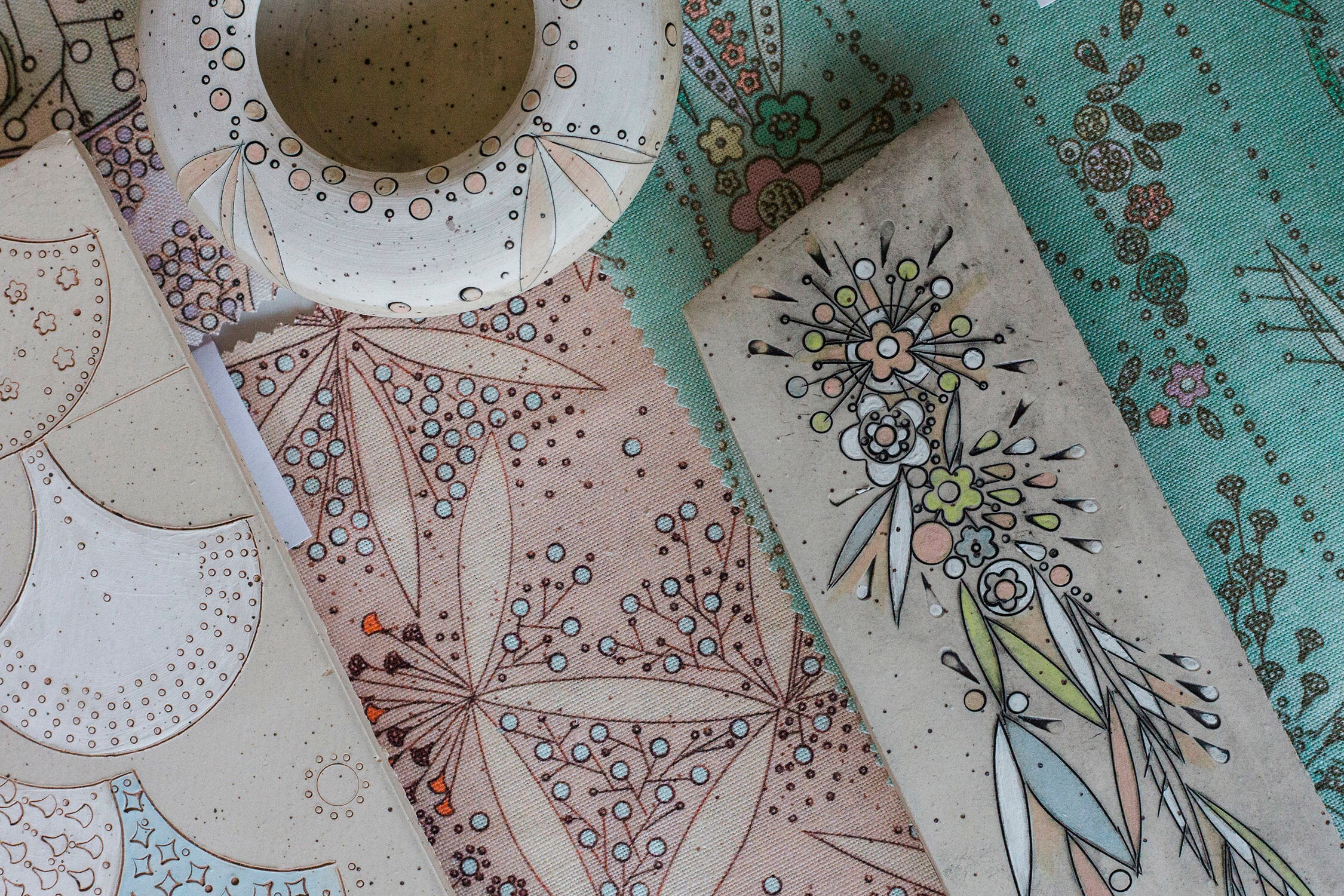 Along with hand-molded ceramic pieces and patterned fabrics, Prior turns her clay manuscripts into whimsical wallcoverings. “I use the same process as I do for fabric, except the patterns are printed onto a really lovely premium matte wallpaper,” she says. “I use raw clay like a sketchbook—it’s the starting point for all of my designs.”