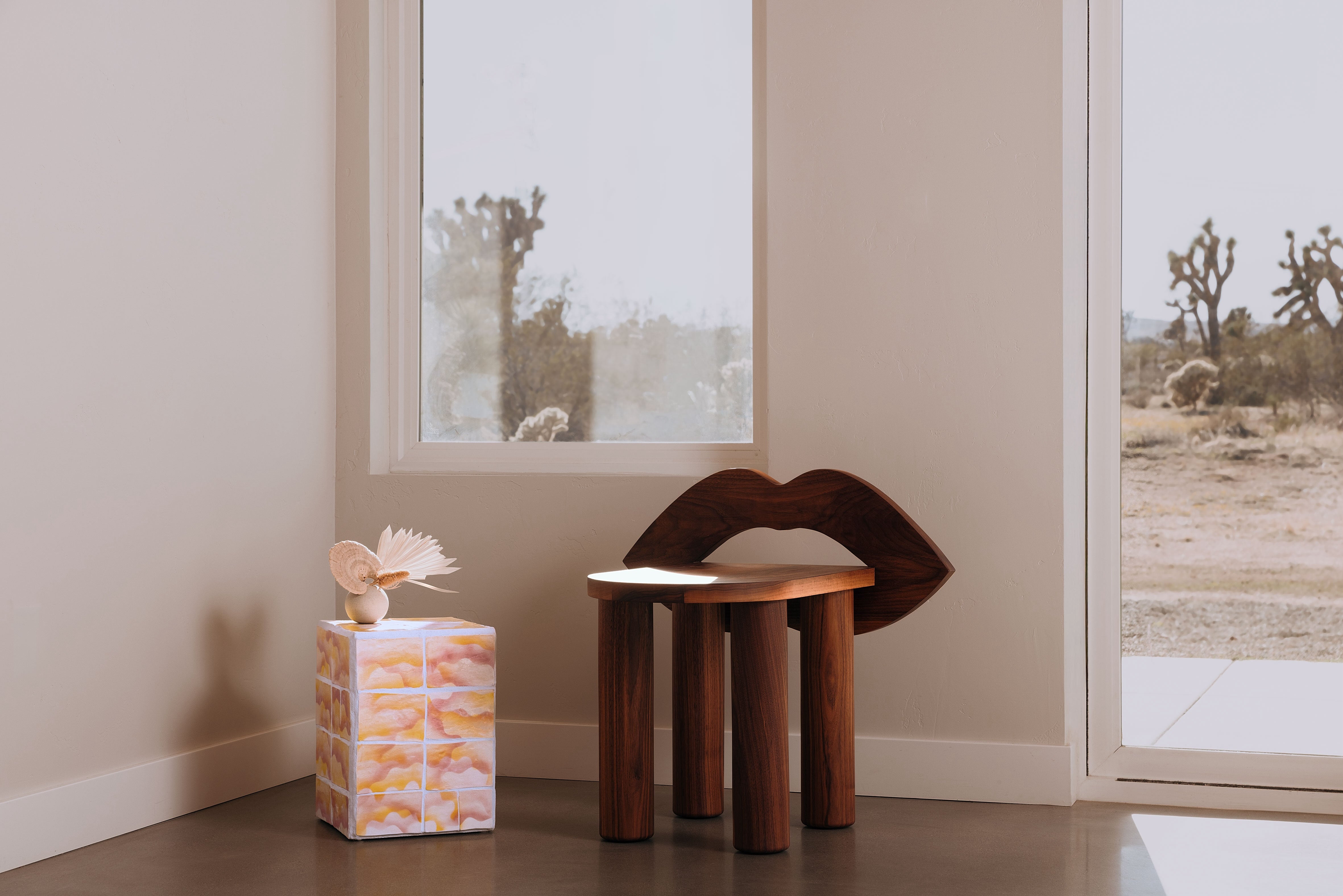 Two of her favorite designs are the Mouth chair and Tiled Triangle console. The anthropomorphic chair, which began as a small side table she designed in 2018, is crafted in solid walnut and resembles a mouth sticking out its tongue (the tongue being the seat). “Honestly, it makes me laugh every time I see it,” says Shah, adding that she hopes to develop the piece into a full-bodied collection. “I try to let warmth and play show up in the work, even in small ways. There’s always room for a bit of humor. I think objects should make you smile as much as they make you think.”