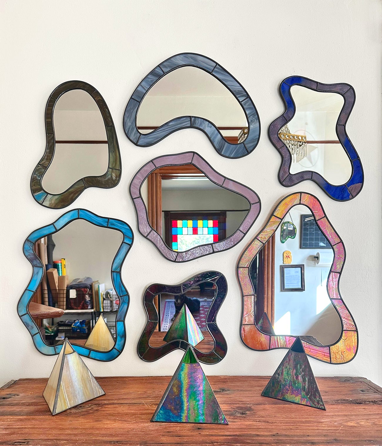 Burnstein’s artful mirrors strike an aesthetic that lands somewhere between a Tiffany lamp and a lava lamp—the centuries-old stained-glass tradition gets an energetic, irreverent update via kaleidoscopic borders and free-form shapes. “I draw everything, and I’m definitely inspired by psychedelia and forms found in nature,” she says. After drawing on paper, cutting out those shapes and tracing them on to glass, the individual pieces are cut, assembled, foiled and soldered, with cleaning in between each phase. Then the mirror is ready to be hung.