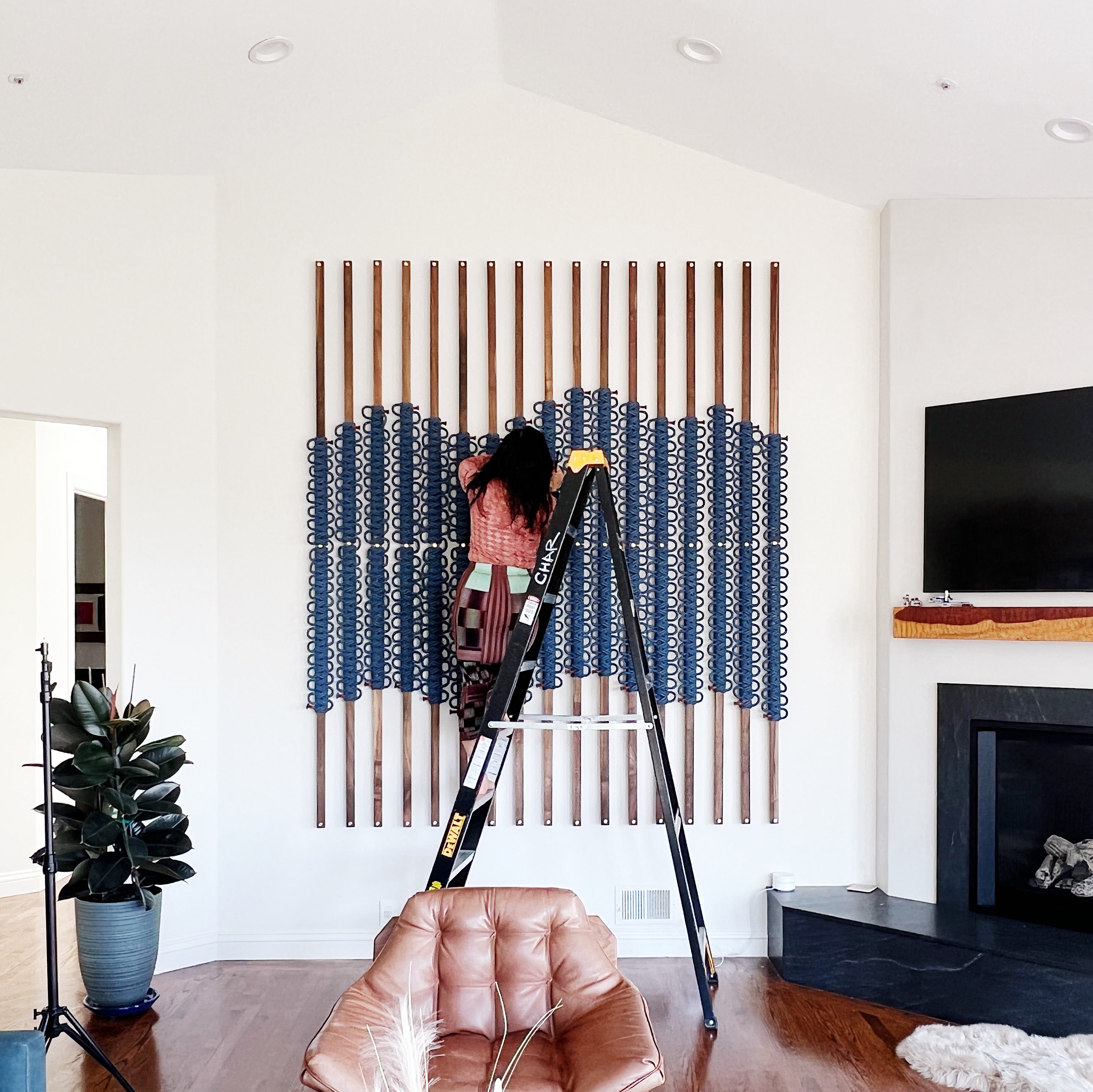 Knots were not the first medium she explored. Chien spent about a year dabbling in various workshops before a macramé class ignited a childhood nostalgia. “My mom had taught me macramé when I was a kid in the early ’70s,” says Chien. “I remember loving it, but I couldn’t remember how to get started. So I took a refresher class, and within five minutes, I fell back in love with it.” By 2015, she had launched her studio, focusing on knot art.
