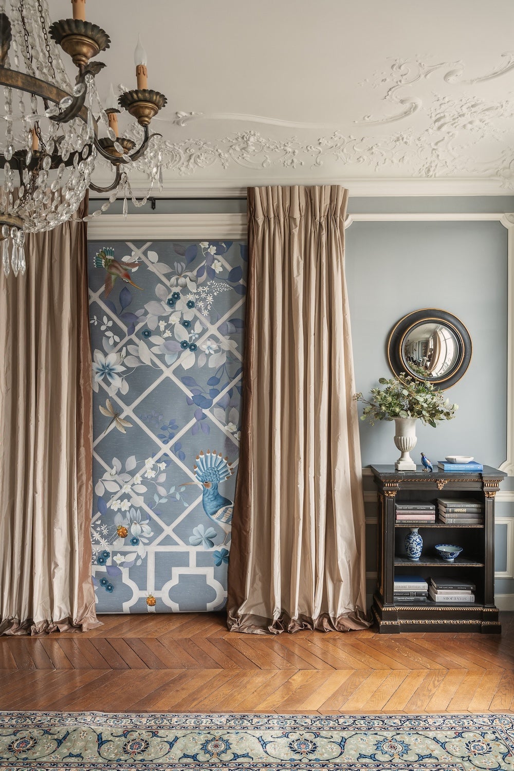 Cheung Wolf and her team employ an array of dexterous old-school methods when crafting their designs. Typically cast on silk, the intricate wallcoverings showcase everything from hand-painted gongbi-style brushwork to haute-couture-quality beading and embroidery. “Every little detail takes hours to refine,” she says.