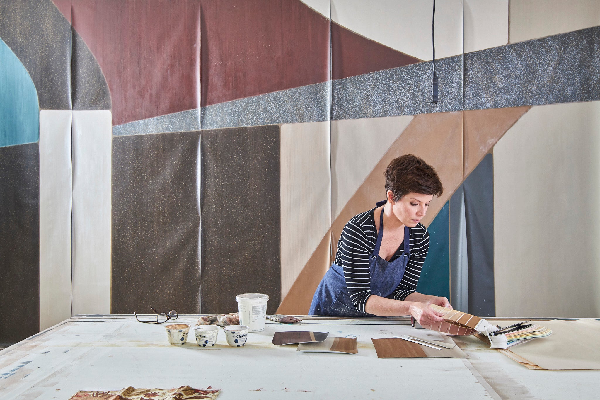 Homepage image: Liane Ricci works on a Bespoke Muralpaper for the Kips Bay Decorator Show House Dallas inside her Durham, North Carolina studio.| Photo by Brad Bunyea
