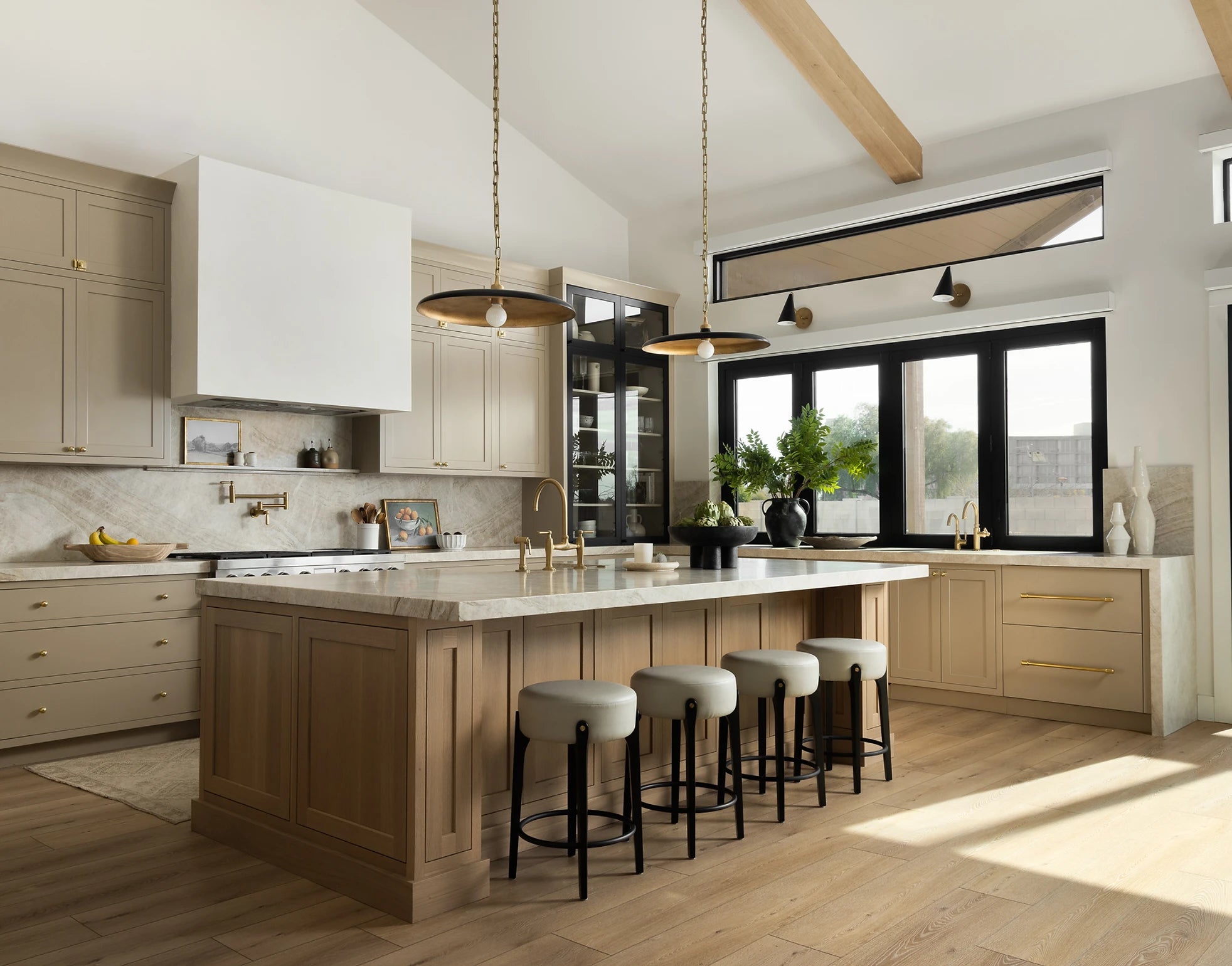“For me, it always starts with layers of lighting—not just overhead, but under-cabinet, pendants, maybe even a sconce or two if we can make it work. It completely changes the mood of the kitchen and makes it feel warm and intentional, not just functional. Also, a hardworking island should anchor the kitchen both functionally and visually. Whether it’s used for prepping, gathering, or a glass of wine at the end of the day, it still needs to have a presence aesthetically. Think outside of the ‘waterfall edge’ box and get creative.” —Britany Simon, Britany Simon Design House, Scottsdale, Arizona