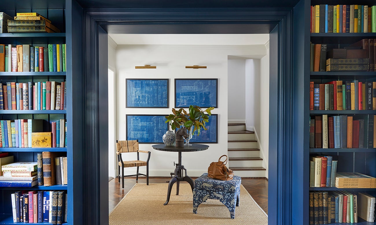 Homepage image: A cobalt blue library by Douglas C. Davis & Associates peeks through to a light-soaked entryway. | Jean Allsopp