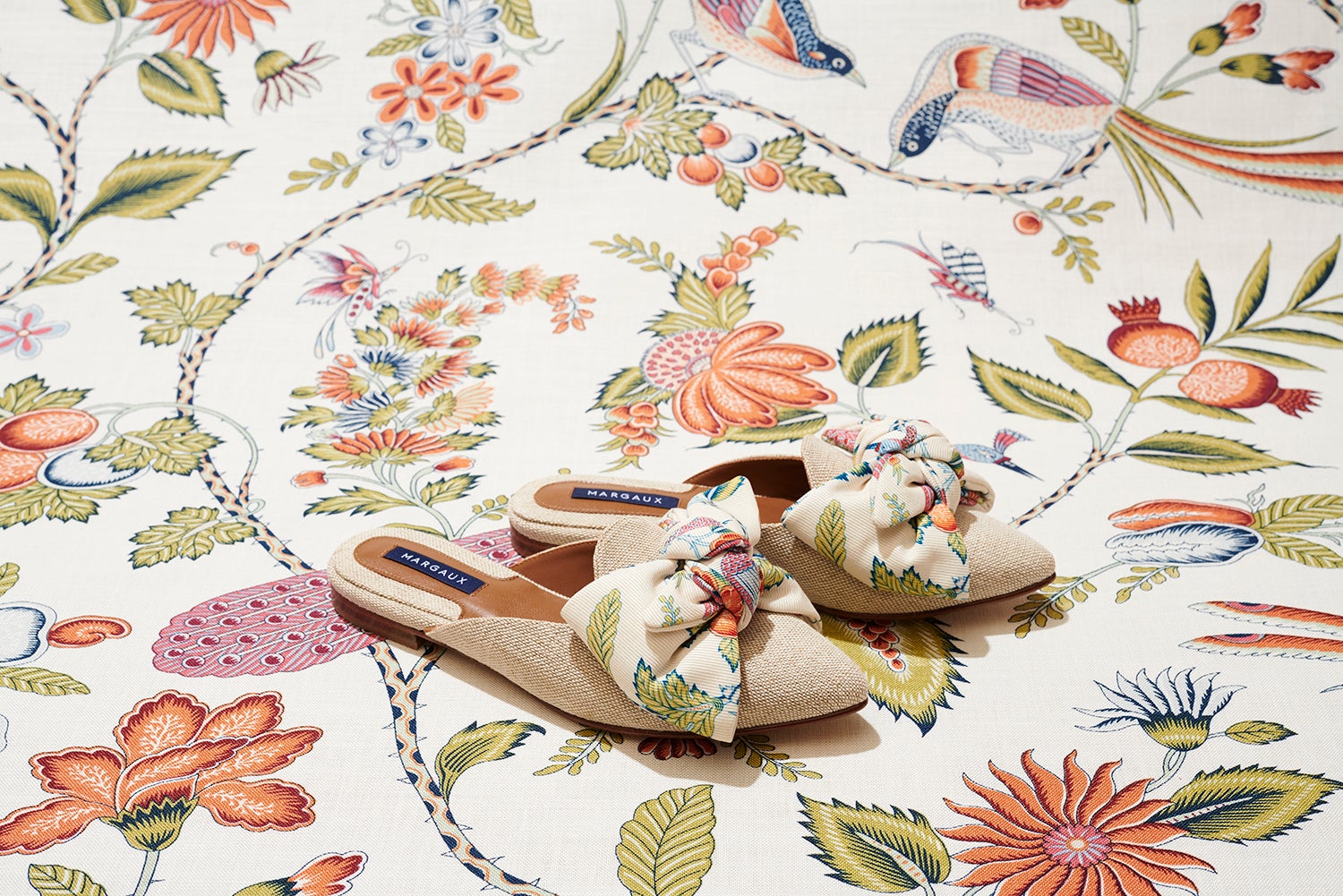 “These shoes are just so charming,” she says. “Margaux has certain [signature] silhouettes, and I think that the [Schumacher] patterns turned them into something so special.” Successful brand matches tend to capitalize on a shared sensibility, and Margaux’s thoughtfully designed, modern shoes jibed naturally with Schumacher’s fresh, traditional patterns. While the collection debuted with the Campagne print, the whole collaboration, which was announced yesterday, features five of Schumacher’s textiles. And to the Margaux founders, the timing could not have been better. “We are not just in a moment where people are excited to get dressed again, but also people are shopping and looking more than ever before for really special things,” says Pierson.