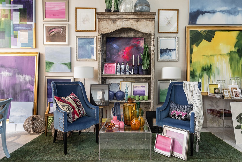 I would call it eclectically styled, and that’s very intentional—I wanted to mix modern and traditional. Barry’s artwork has kind of a contemporary lean to it. We usually do things by color story within the space. It’s harder to buy for that store, because I like to mix in older pieces. I have some antiques, I have some Baker chests, I have some more modern pieces.