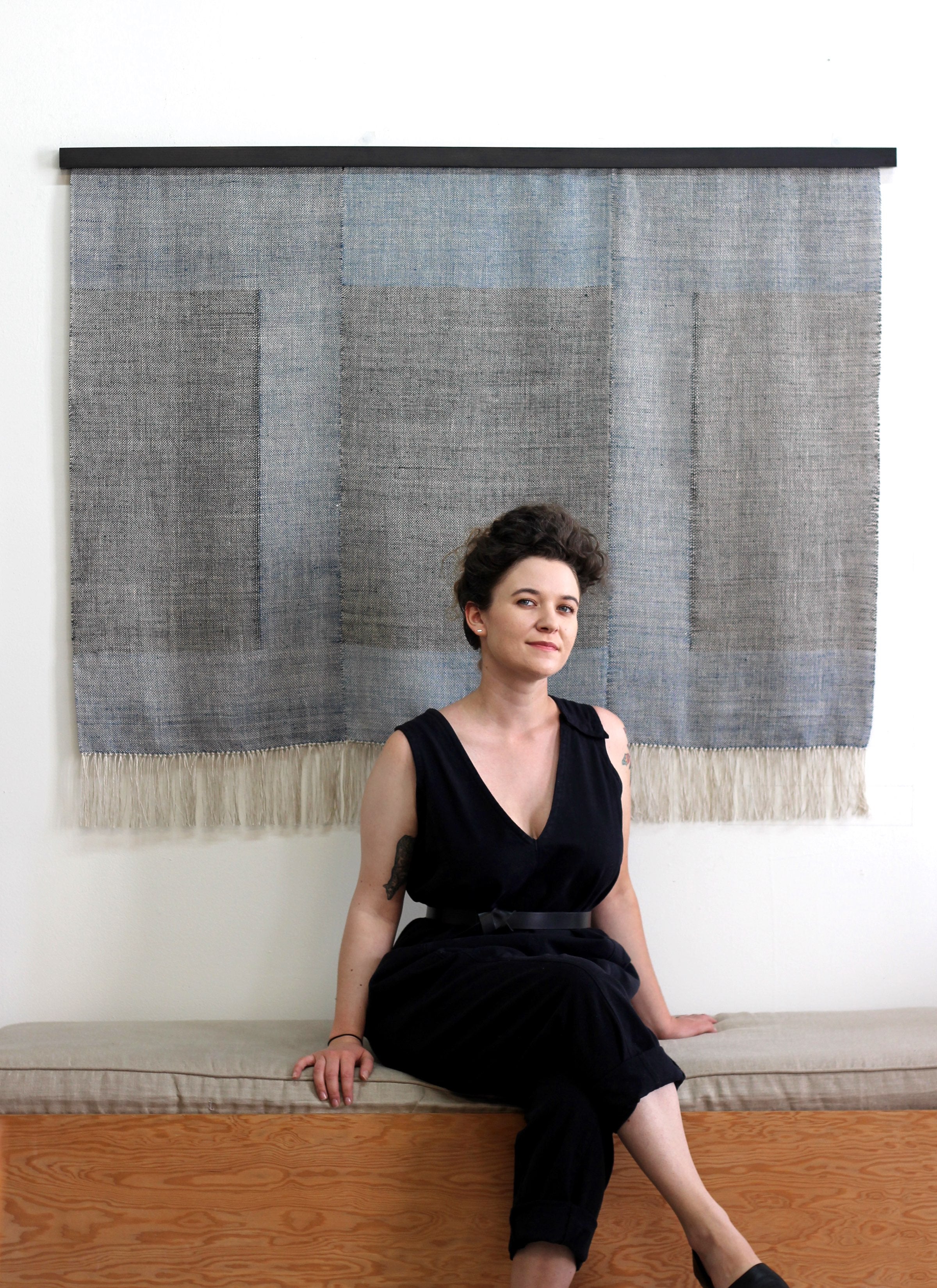 The artist’s minimalist, abstract designs feature balanced geometric compositions, where layers of line and shape create a subdued statement. The hours that go into each project (sometimes well over a month of work to execute a single piece) tell the story of the hand that made them—there’s a certain rhythm evoked by the weaving, each warp and weft casting a spell that makes the pieces stand out. “My work is very structured—I have a certain way that I make my drawings and my weavings,” she says. “But because my pieces are handwoven, they take this rigid structure and soften it, and it allows you to get lost in the minute details—I think it is more relaxing because of that.”