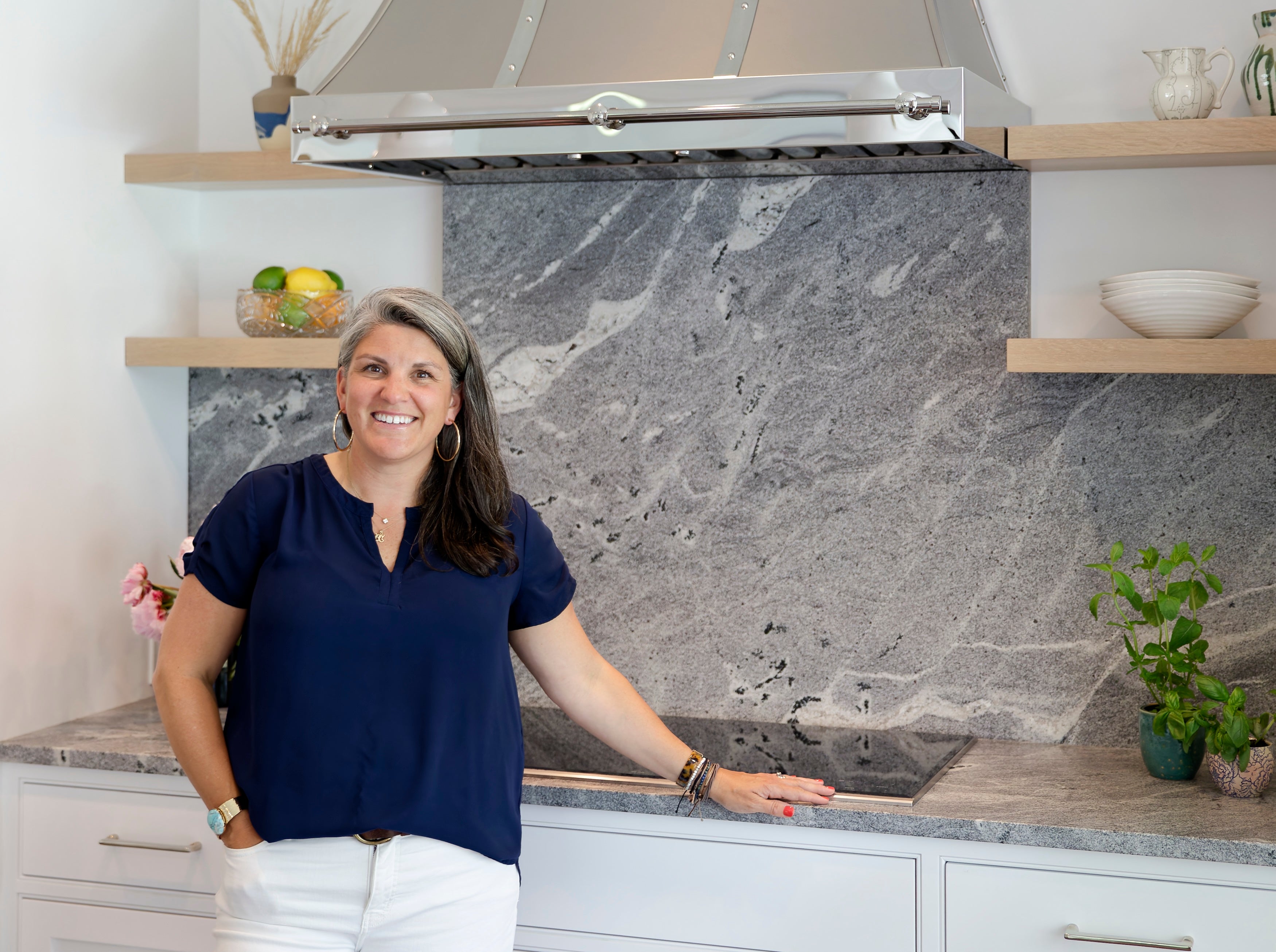 Yes and no. We knew we needed that separation—that if Anthony was going to join the business, we couldn’t work and live as parents and do all the things under one roof. But the other big part of it was that my house is not as organized as the houses we design, so we don’t invite clients to our house. In order to meet with folks, I was lugging everything to them—and when you get to the job that’s an hour away and you’re like, “Oh, crap, I forgot that tile sample I was going to show them,” it’s too late. Or I was going to a coffee shop and taking over three tables. Now we have a beautifully designed conference room with gorgeous rugs and plenty of space—and then behind closed doors is our office and resource library. If I’m in the middle of a meeting and we need to pivot during a presentation, I can say, “Hold on a second, I have an idea,” instead of being like, “I can show it to you next time.”