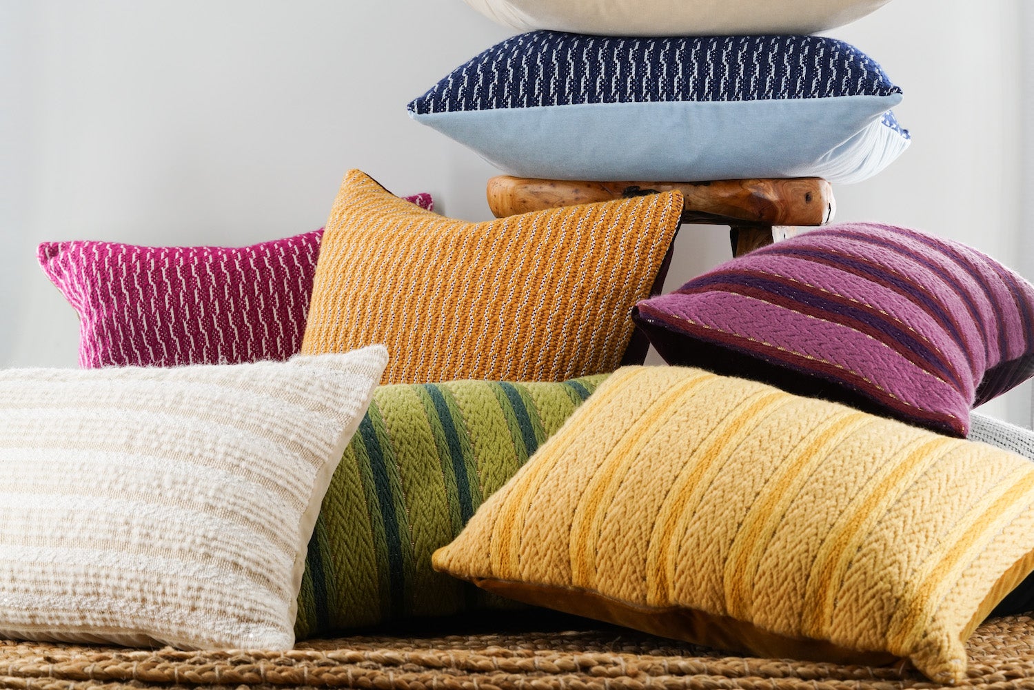 More recently, she debuted a line of hand-loomed pillows—including the Crème de la Crème, Glitch and Jewel Stripe—at Somerselle. “All three of these designs play with contrasting weights and textures,” she says. “The Glitch, for example, is woven with wool from sheep in Colorado and Wyoming as well as a cotton yarn that makes them 100 percent compostable, and the Crème de la Crème is composed of soft alpaca yarn and raw jute.”