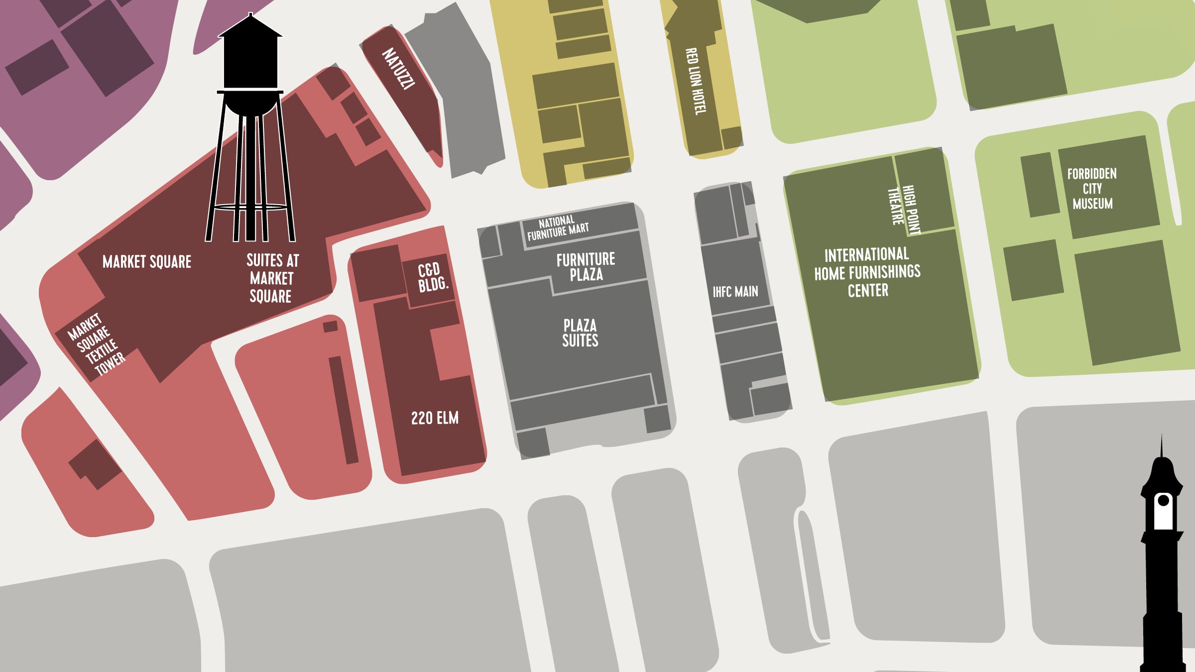 Let’s face it—High Point is huge, and you’re going to spend a lot of time on your feet as you seek out the latest and greatest. Even the most seasoned Market veterans need a bit of help making sure not to leave any stone unturned. That’s why we’re mapping High Point’s bustling neighborhoods and the go-to resources located in each. Here, we’re spotlighting the brands featured in our Designer’s Guide to High Point Market—plus a few more key destinations and debuts so you don’t waste a single step.